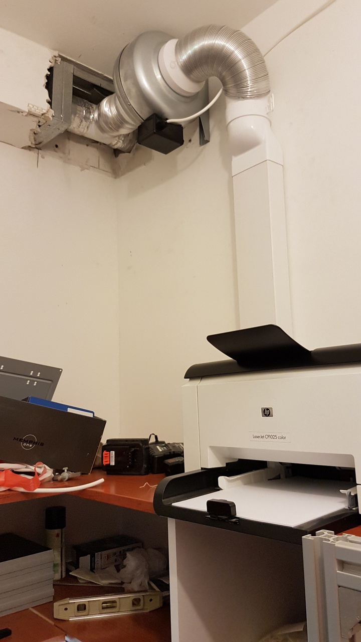 Ja és vettem egy pici NAS-t amit felszereltem a plafon alá a sarokba. A projektjeim forrásállományai mostantól ide mentődnek titkosítva. Mellette a falon felszereltem egy kisebb radiális ventilátort oda ahol eddig a légszelep volt. A hátulsó fal tetején a gipszkarton mögött megbúvó szellőzőcsőből kiflexeltem egy darabot, betoldottam egy T-idomot és felszereltem egy egész komoly radiális csőventilátort. Hatalmas a légszállítása (450m3/óra!), a nyomása (40 méterig elnyomja a levegőt!) és a hangja. Ez le van vezetve egészen ahhoz a részhez ahol forrasztani fogok, hogy a forrasztási gőzöket elszívja.