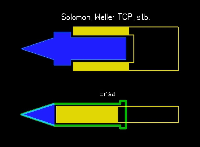 Az Ersa hegynek vas (kék) csak a hegyében van, az egész hüvely ami a hőt vezeti az réz (zöld). A fűtőszál a hegyet nem körülveszi hanem benne van, így a levegőt nem fűti hanem kizárólag a hegyet. Ilyen kivitelű a Hakko 907 klón is, csak annak az egész hegye vasból van.