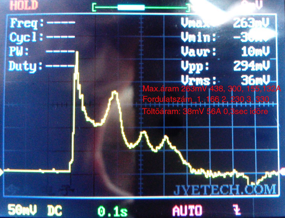 Talán érdekes lesz, amit mutatok. Ez itt egy oszcillogram, egy önindítási és a jobb alsó sarokban az akku kezdeti töltési folyamatáról. Egy 150A-es sönt van nálam a testelő ágban, annak feszültségeséséről (-ből) származnak a számított adatok. Indítózás után (jobb alsó sarok) 0,3 másodpercet (eléri az 56A-t) követően már 5A alatt van a töltőáram, fogyasztó még nincs a rendszerben, csak ami a motorhoz kell. A motor 0,5 másodpercen belül jár, láthatók a sűrítési csúcsok áramfelvételei és számítottan az egyes félfordulatokhoz tartozó fordulatszámok, amely emelkedik természetesen. Motor 1,25l, benzin, akku 45Ah (nem fért bele nagyobb), ca. 10 fok, motor hideg, ez azért a 3. indítás volt, addigra lőttem be a szkóp beállításait. Üdv: StMiklos