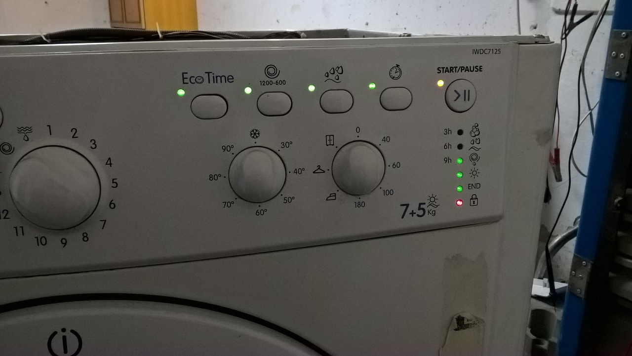 Adott egy Indesit Iwdc7125 mosó-száritógép. Kitakarítottam a szivattyút mert megakadt a sok szeméttől és cseréltem a szénkeféket is. Program indítás után pár másodperccel -elindul a szivattyú vagy a főmotor programtól függően- kiáll hibára. Képet csatolom. A felső sorban villog az összes led az alsó folyamatosan világitanak. Nem tudom sajnos belőni a hibakódot illetve a problémát sem. A panelon a csatlakozókat végignéztem szerintem jók. Valaki?