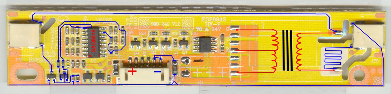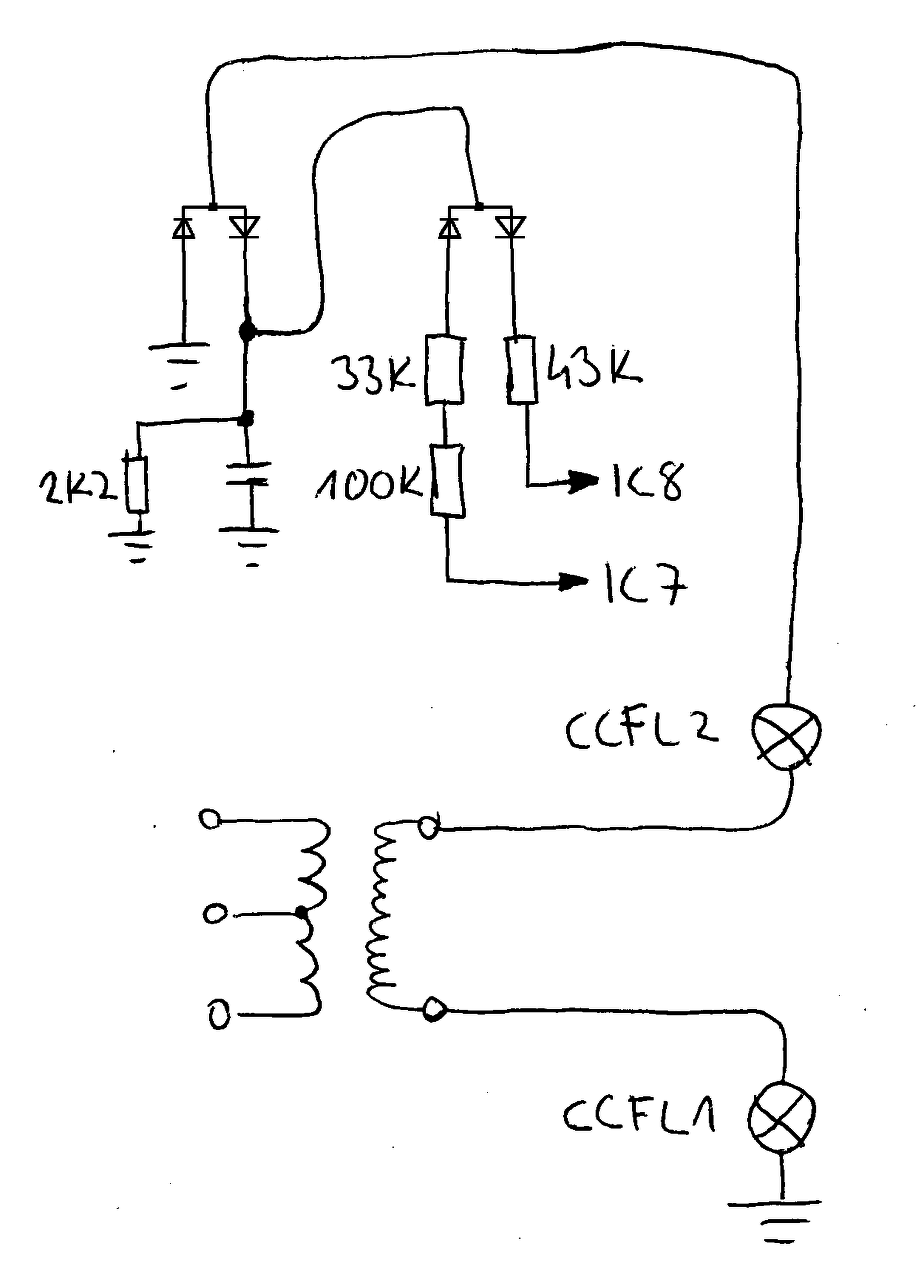 A nagyfesz trafó szekunderről kijön két pin, egyik az egyik lámpa csatlakozóhoz megy, a másik a másik lámpa csatlakozóhoz megy. A csatlakozók másik pinje pedig az egyiknél testre van kötve, a másiknál pedig egy három lábú (A7 jelzésű) SMD alkatrészen keresztül megy a testre... Nem értem. Miért csak az egyik csatlakozón van SMD alkatrész? A hozzászólás módosítva: Dec 28, 2017