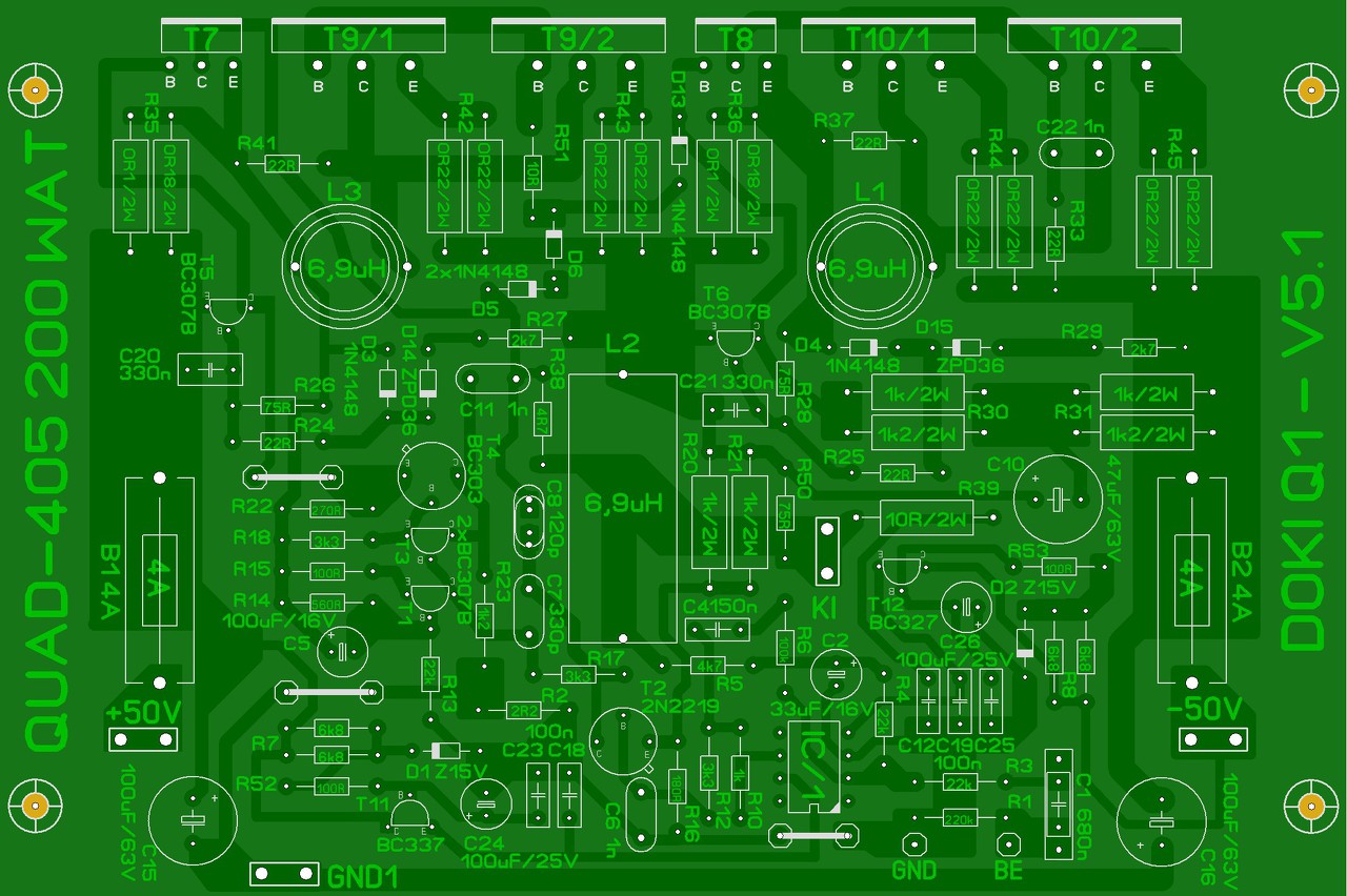 Segítségeteket kérném, megépítettem az Alkotó által megrajzolt R.Ludvigos Quad 405 V5.1, a problémám a következő lenne. Élesztés rendben sikerült, szekunder oldalban + és - ágban egy egy 60 w-s izzó, végtranyó nélkül, meghajtók bent, bemenet rövidrezárva, nagyon alaposan végigolvastam szinte a teljes fórumot. Végek 4 db MJL 3281A, meghajtó 2 db MJE 15031G, Trafó 2 x35V 800W toroid, egyen fesz: 2X49,6V, puffer 4 x 10000mF, bekapcsoláskor izzó nem világít, fel se villant, pozitív oldali nyugalmi áramfelvétel:62,5 mA, negatív oldalon:55,4 mA, kimeneti egyen fesz:31,7 mV. Végek be, indítás újra, mérés ugyan ez. Hangfal, bemenet meghallgatás izzó korlátozóval, kis hangon, szól semmi rendellenesség, csak azR30, R31 melegszik de ez természetes ha jól gondolom, olyan 70 fokig melegedig és ott tartja, mértem műszerrel. Szóval izzó ki, biztosíték be 4 A, mivel élesztéskor 1A volt bent. Minden rendben, szépen és tisztán szól, viszont mobirlól próbáltam és olyan, mintha nem vezérelni ki, olyan, mintha 30-40W jönne ki, megpróbáltam más bemeneti eszközt, laptop, itt javult a helyzet, de még mindig kevés, másik hangfal ugyan az, másik kábel semmi javulás, ugyan azon kábelek és hanfgal, van másik erősítőm Sharp system 7700 végfok ami elvileg 2x120W szól becsülettel, azoh viszonyítva alig fél hangerő, inkább alatta. A panelt saját magam rajzoltam mert amikor elkezdtem nem találtam nyák rajzot. Az alkatrészeket kivéve a kondenzátort beültetés előtt kimértem, még csak az egyik panel készült el. Lehet valahol felcseréltem valamit, olyan mintha nem vezérelné ki a végfokozatot. Bemeneti inpedancia, 219,5 kohm, kimenet 0,673 kohm. Ha tud valaki sgítsen. Pár képet felrakok. https://drive.google.com/open?id=10S-pgIr-BqIP-b8h6bJ7XdrrNi9_OBbg