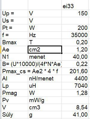 Érdekes kísérlet lenne mondjuk fix 300W-al terhelni mondjuk egy rezonáns tápban, és megmérni párféle frekvencia beállítás mellett, hogy hány fokig melegszik a trafó. Esetleg ugyanez eljátszható lenne más teljesítmény (pl 100W) mellett - bár ez utóbbi eredménye szinte borítékolható lenne, az előbbi megmutatna egy jó kompromisszumot. Nekem a 0,22T kicsit soknak tűnik (inkább 0,15...0,18T-re méretezek ha lehet), de ez valóban attól függ mekkora melegedést tudunk elfogadni. Tudom, ezeknek a vasmagoknak akár a 80...100°C is simán üzemi hőmérséklet, de én nem szeretem a forró trafókat, (meg úgy általában a forró alkatrészeket). A másik, de ebben nem vagyok biztos, hogy az 1,2cm2 több mint a vasmag effektív keresztmetszete, 1cm2-re emlékszem, de lehet, hogy rosszul. Van adatlapod az EI33-hoz? A hozzászólás módosítva: Márc 15, 2018
