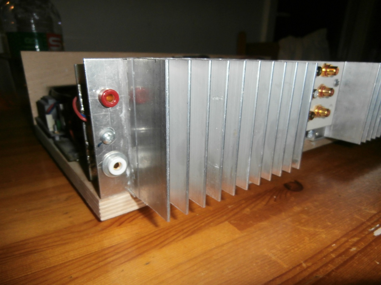 Nem vitázva, de tényként, közel fele hűtőbordával, nyitott alsó polcon, falig betolva, nálam langyi. Az emlegetett konstrukció nálam, a hátsó faladdal majdnem egyező, de nekem arra van szerelve a két különálló hűtőborda mivel monoblokkban van megépítve. Az erősítőblokk a hűtőbordára van szerelve, tükrösen, középről, a két széle felé. Középen közöttük van a bemeneti váltó, a műanyagházas potival, mivel a két test nem egy potenciál. És a bemeneti csatlakozók közelsége miatt ugyebár nem kell árnyékolt kábel. A két végénél a hátsó falon vannak a védelmek szerelve követlen a hangszóró csatlakozó felett. Legalább akkora omron jelfogóval mint nálad, de felese panelon. Ezáltal igen rövid a készülékben a bemenő, és kimenő kábelezés. Az erősítő panelek ellőtt vannak a pufferek 2200µF-okból, az előtt pedig a trafók a homlokfalnál. A készülékben 5db trafó van építve, 2db a végerősítő, 2db a védelmek, és egy az egyéb. A hangerő, és a bemeneti váltó rudazattal jön közel középen, az előlapra. A mivel igen közel vannak egymáshoz(amit az elektronika igényel), ezért ezt két fogaskerékkel ellensúlyoztam, hogy kellően lehessen használni. A készülék földcsillagpontjait a hangszórók testpontjaira szoktam építeni. A készülék csak tömör ezüstözött rézhuzallal van megépítve(eltérő vastagságú). A védelem még soha nem működöt, napi használat mellett sem. Elek