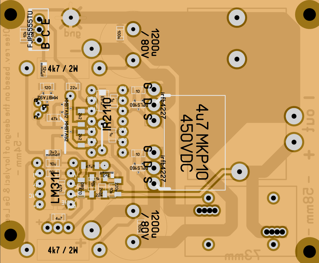 A + tápon lévő 1200µF-os kondi GND vezetékét szélesítsd ki amennyire csak lehet. A nyáknak ennek az oldalának bal részét (legalábbis a "battom_szeles.png" képen) gyakorlatilag teli földé lehetne alakítani. Elvileg a kettő táp kondi kis induktivitású összekötésére figyelmet kellene fordítani, ami széles, teli föld szerű összekötéssel oldható meg.