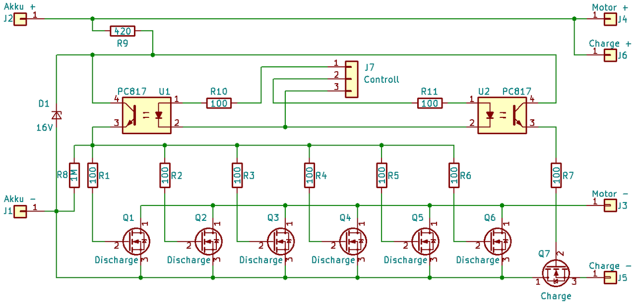 Kérnék egy kis segítséget. Van ez a kapcsolás amit most dobtam össze. A feladata egy akkucsomag töltés és kisütés tuláram védelme lenne. Az akku feszültsége 37V-63V között változik a merültség függvényében. J1/J2 csatira megy az aksi, J3/J4 csatin megy a terhelés, J5/J6 csatin jöhet be a töltés. Persze a terhelés és a töltés csak akkor "mehet" ha a J7 csatin érkező jel ezt engedélyezi, az optocsatolókon keresztül. Szóval én úgy gondoltam, mivel a feszülség elég széles tartományban változik, valamennyire szabályozni kellene a kapcsoló FET -ek (Q1-Q6) vezérlőfeszültségét, ezért tettem bele a D1 16V -os zénert, melynek az R9 az előtétellenállása. A megadott 420Ω értékkel 40mA van beállítva jelenleg, egyébként az optocsatoló maximuma 50mA. Az R1-R6 ellenállások ezt egyenlő részben osztják el a kapcsolóelemek részére. Az R8 pedig azért került be, ha "tiltva" van a terhelés a kimeneten, akkor a FET -ek GATE lába le legyen húzva testre. Igaz ez így közös megoldás, nem tudom érdemesebb lenne -e külön betenni mindegyik GATE -re lehúzóellenállást? A Q7 elvileg a töltést tiltaná ha szükséges, de most azon gondolkodom, hogy lehet az nem is kellene, ugyanis az akkucsomag elég nagy kapacitású lesz, kb 10-15Ah, a töltő pedig csak max 5-6A áramot képes leadni... Volna valami javaslatotok, hogy mit érdemes/kell változtatni ezen a rajzon, vagy megfelelően működőképes lenne ez így?