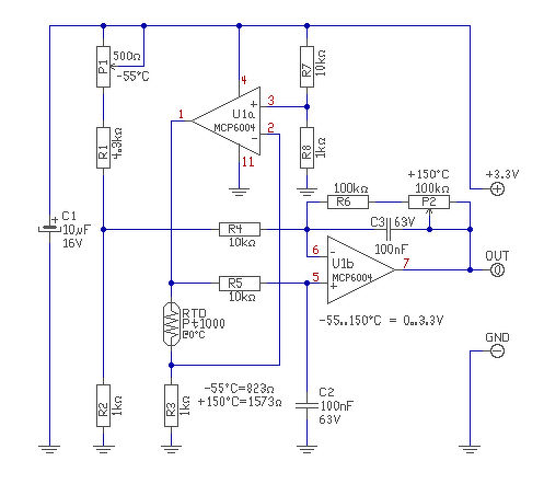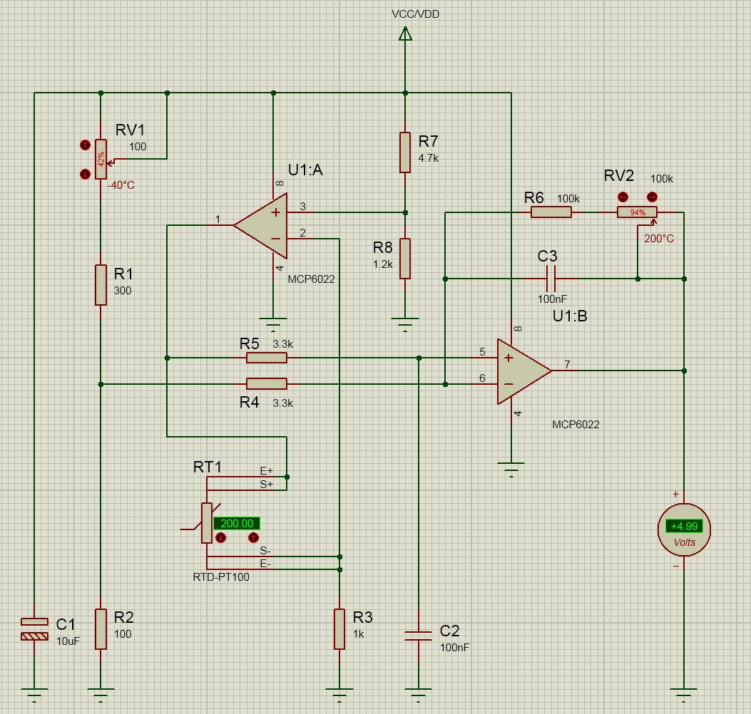 Kicseréltem az erősítőt MCP6022 - re, így -40°C - nál 10mV, 200°C - nál max. 4.5 V feszültséget mér a kimeneten. Ha az RV1 potit feljebb állítom, akkor 4.99 V a végső határa, de így a -40°C - hoz tartozó érték nem lesz jó.