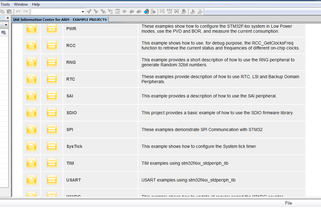 Van az IAR IDE-ban egy letöltő rész ott szerepel az összes, de a 4GB amit lehúzott és feltelepített automatikusan, abban egy darab példa sincs.. Fura. STM32F407ZET6-om van, gyári fejlesztő panelon. Számít, hogy melyik típusra töltök le példa programot? Mármint amit te linkeltél az a VG végződésű én pedig ZE-t használok. (144 pin) A második linken rengeteget kotortam, de csak linkek vannak, letöltés nem igen vagy nem az ami érdekes lenne. Mutatok pár képet a letöltött 4GB-os "example" csomagról. Az érdekessége, hogy látja, hogy letöltöttem, de minden könyvtár üres. A példa könyvtárat megnéztem külön is, sajna üres. Idézet: „Egy nagyobb pakk nem létezik ehhez?” Léteik. Letöltöd a CubeMX-et. Telepíted az F4 device pack-t. A telepítési könyvtárban lesz egy halom minta projekt. De közvetlenül is letöltheted.