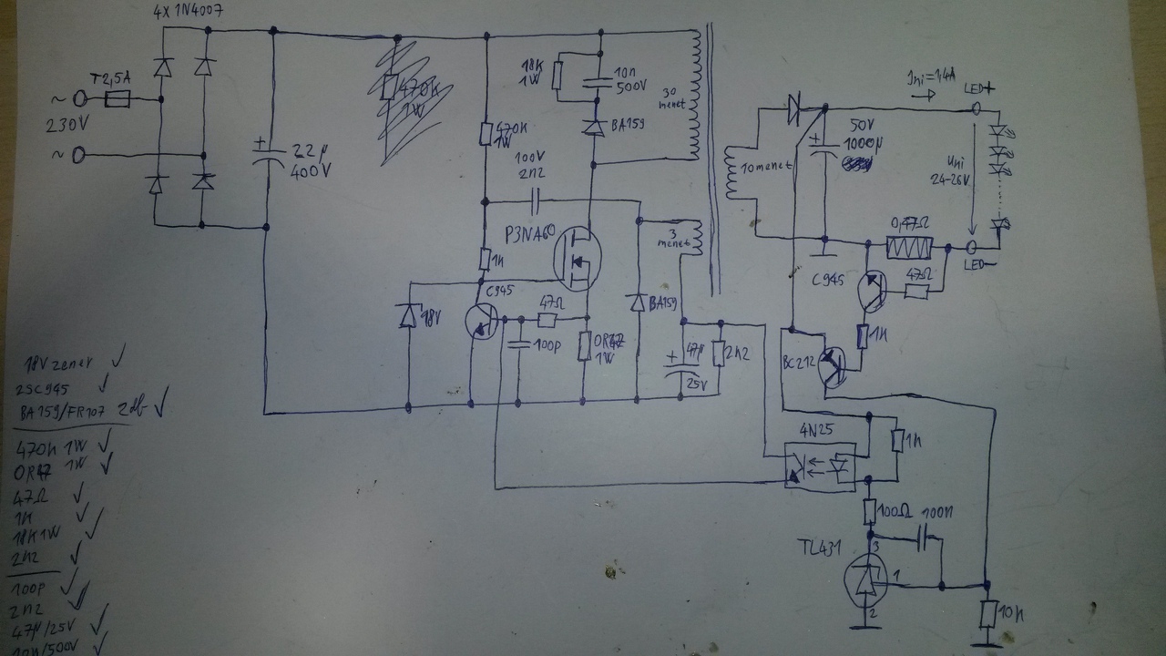 Építettem egy áramgenerátoros kapcsolóüzemű tápot a 40W-os LED-es lámpámhoz, mert a saját tápja tönkrement, és egyszerűbbnek láttam újat építeni, mint a régi tápot kibányászni a gyantás trutyiból. A régi tápra ez volt írva: "Constant current LED driver, 1,4A, 15-30V DC" A Problémám a következő: A táp működik, a ledek is szépen mennek róla, viszont elég hangosan "szörcsög" a trafó. A ledek helyére szabályozható műterhelést kötve rájöttem, hogy csak kb. 16V felett hangoskodik, ha ez alá megy a kimenő fesz, akkor csöndben van a táp. (A ledeknek kb. 25V kell.) Próbáltam letekerni valamennyit a szekunder menetszámból, de nem sokat segített. Lehet, hogy a TL431-nek nem tetszik az a tranyós megoldás az áramkorlátozásra. Nem tudom mennyire jó ez a megoldás, de működik, mert 5-40V-ig szépen tartja az 1,4A-t és nem is ingadozik. Csak hangos... ![]() Mellékelve a kapcsolás, elnézést az igénytelen rajz miatt, de most nem volt kedvem újra rajzolni. ![]() Ha valakinek van valami ötlete, azt előre is köszönöm! A hozzászólás módosítva: Júl 13, 2018