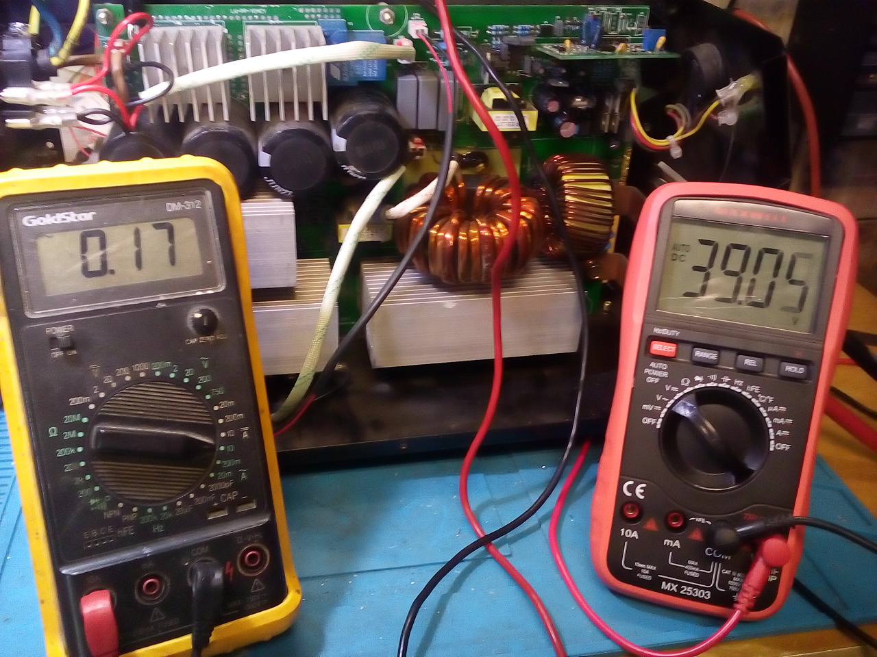 Köszönöm az ic-k lecsiszolva természeresen, vagy gyantával eltakarva. Ami a legdúrvább, hogy 350 Amperre írja a maxot jól átvágják a vásárlót. Kicsit feltuningolom. A két 450µF puffer kondit kicsinek érzem. Egy 2x1000UF jobb lenne, főleg ha hegesztek vele, a kis kondikat holnap nézem meg.