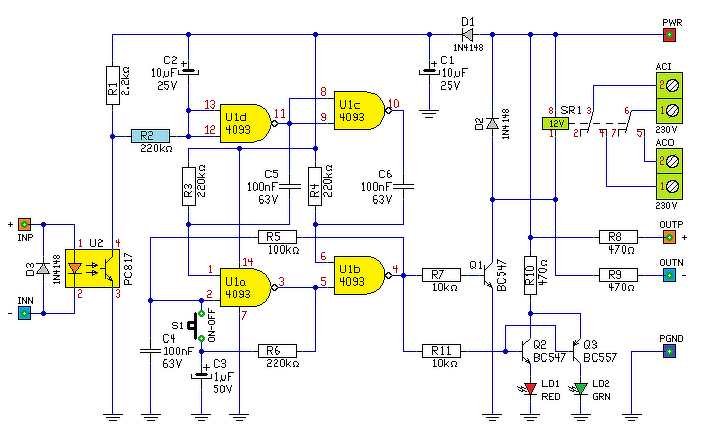 A gomb megnyomásakor az R2-őn keresztül a C1 töltődni kezd. Ha hosszan van nyomva, feltöltődik és így U1a kimenete alacsony szintre, U1d 13-as bemenete magas szintre vált.