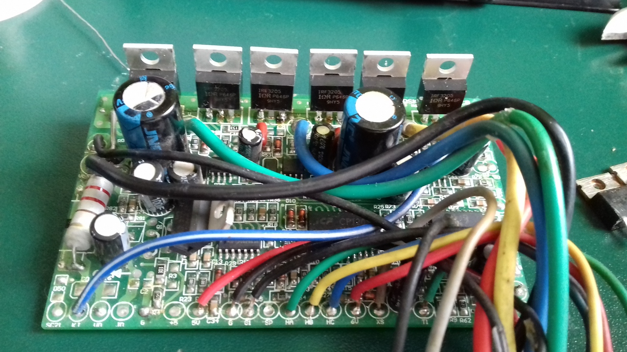 További ellenőrzés a FET-ek gate ellenállások kimérése, utána a pozitív bemeneti körön lévő alkatrészek ellenőrzése. Ha mindent rendben találtál, akkor helyezd áram alá a vezérlőt, mérd meg a gáz vezeték pozitív és a hall elemek pozitív szálain megközelítőleg az öt-hat voltnak kell lenni. Áramtalanítás után csatlakoztasd rá a motort, gázkart. De azért előtte a motor hall elemeket ellenőrizd. Újra helyezd áram alá a vezérlőt és a motor hall elemek zöld, sárga, kék vezetékein 0...5 voltot kell mérjél a motor lassú forgatása esetén. Lassú gázkar forgatásra a motornak reagálni kell.