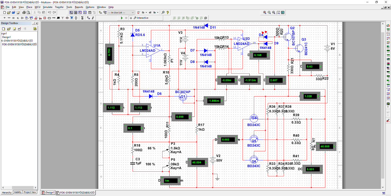 Ismételten megköszönve a segítségeteket, én is szeretném valamelyest gazdagítani a HE közösségének ismereteit. Bár a "Főtanácsadók"-nak erre nincs szüksége, de a magamfajták között akadhat olyan, akinek segítség lehet a mellékelt szimuláció, mely Multisim 14-el készült, és az csupán UKI (CV) szabályzórészt tartalmazza. Igyekeztem a kapcsolási rajz alkatrészeit és pozíciószámait alkalmazni, amennyire ezt a szoftver engedte. Némi eltérés akad, pl.: