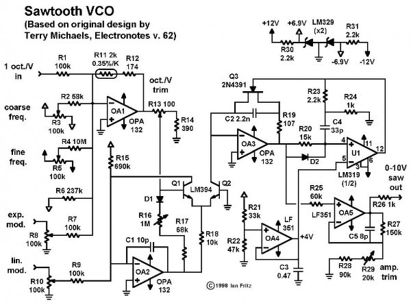 Hangszer céljára a mellékelt VCO-t javaslom, többször megépítettem, nagyon megbízható, alapból egyszerüen beállítható a lineáris feszültség frekvencia görbéje. Vezérléséhez lineáris billentyűzet szükséges, azaz ahány záró érintkező, annyiszor 100 Ohm sorba kötve. Ha elhagyod az áramkör exp részét,akkor exp billentyüzet kell, ami záróérintkezőnként 2 db ellenállás hálózat 1:150-hez, vagy 1:300 hoz. A VCO ból 1 fettel fűrészjel is kivehető. HANGSZERHEZ 2 VCO-t szoktak építeni.
