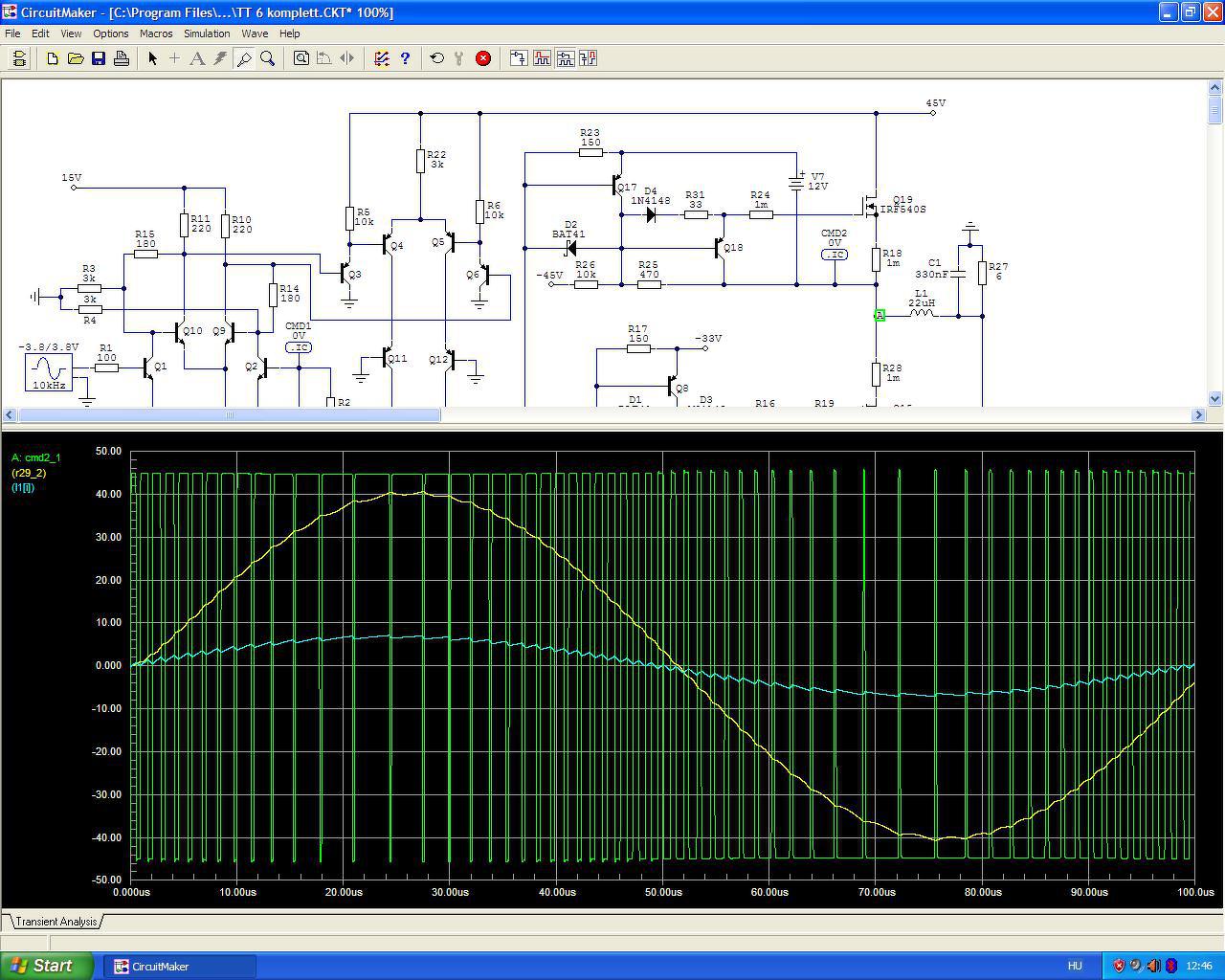 Átnéztem az összes pwm szimulációt (kb. 300) és "összeollóztam" a legjobbnak vélt kapcsolásokból egy trafómenteset. A komparátor késleltetése 10 ns a bemenettől Q7/Q13 kollektor áramáig így maradt idő a fetek nyitogatására. A vivőt még így sem tudom 900 kHz alá leszorítani, de gyorsabb végfetekkel talán még életképes is lehet ez a kapcsolás. Persze még lehet (és kell is) finomítgatni rajta, de ehhez aludnom kell rá néhányat - ahogy ez lenni szokott.