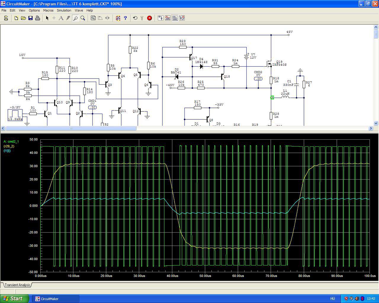 Nagyobb gond, hogy amikor az alsó FET lezár és felső FET nagyon gyorsan rányit a félhíd kimenetére - tehát nagyon gyors az átkapcsolás - és ezt a gyors átkapcsolást a fojtó önindukciós feszültsége még tovább gyorsítja, a drain-gate kapacitáson hatalmas áram folyik hirtelen, amely áram ki akarja nyitni az alsó FET-et. Tehát az átkapcsolás alatt szigorúan rövidre kell zárni az alsó FET bemenetét. Ezért "erősítettem meg" kettős emitterkövetővel a meghajtó fokozatot. Még jobb lenne a lezáráshoz negatív Ugs alkalmazása, csak hát ahhoz újabb segédtáp kellene. Majd ki lesz próbálva mit mutat a gyakorlatban ez a kapcsolás, de nagyon fel kell kötni a gatyát a jó nyák tervhez és egyelőre nincs hangulatom hozzá.