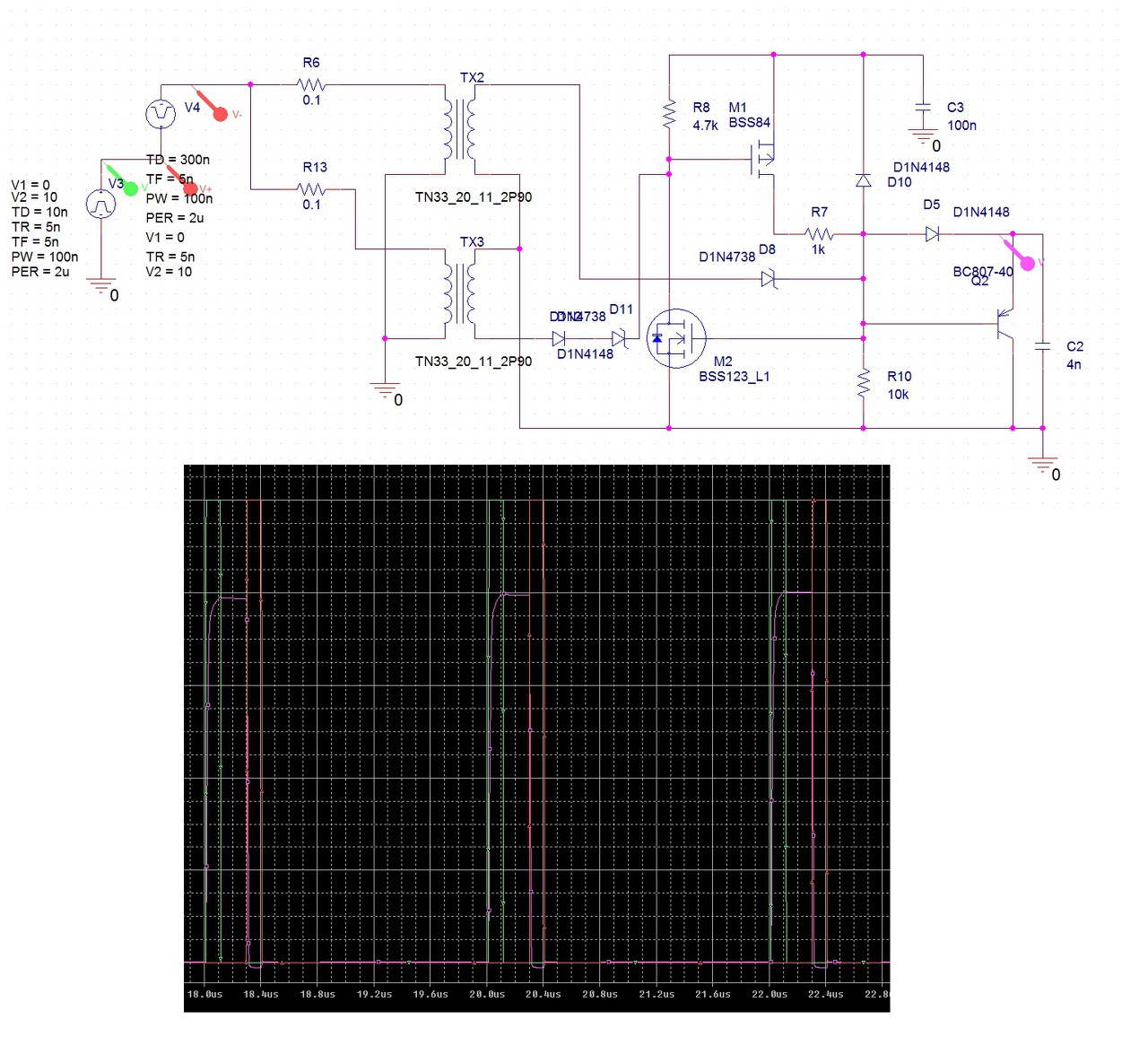 PWM fetmeghajtás átvitele trafón impulzussal. Késleltetés 10-15ns. Trafó csatolás 0.99 amit simán össze lehet hozni. TX2-TX ugyan az a mag csak 2 szekunder leágazással. Trafónak pl elég egy aprócska kis mag 1 menettel mivel a mag csak pár 100nsec -os impulzust kap. pl Bővebben: Link