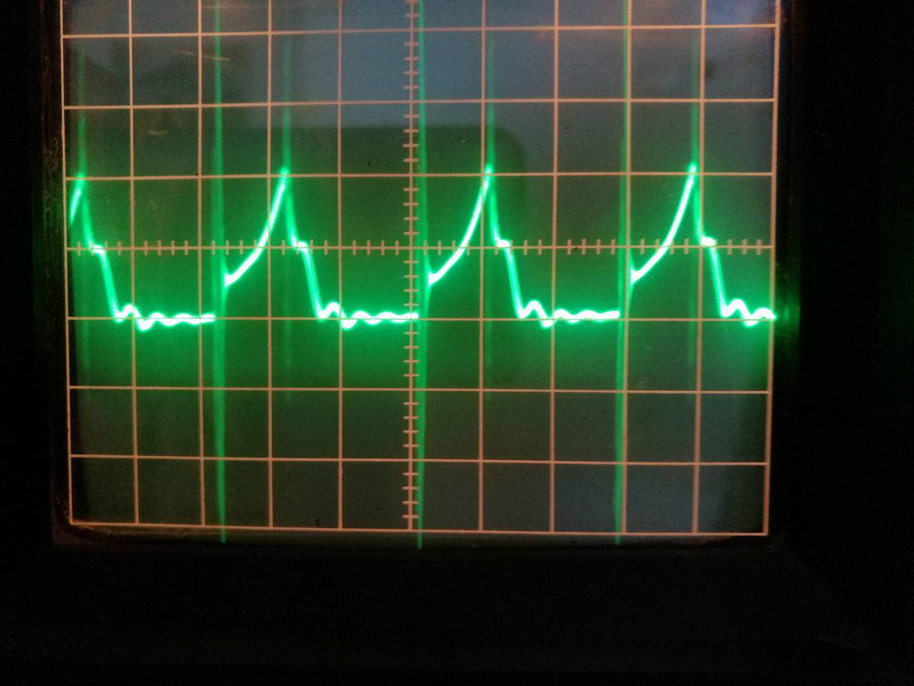 Megjöttek az új IGBT-k, összeraktam a gépet. Felhoztam a nagy trafómat, az egyenirányított feszültség 66V lett az IGBT panel bemenetén. 3db 50W-os izzóval terhelve a hegesztő kimenetét az UC3845 3-as lábán ezt a jelalakot mértem. 10us, és 100mV osztásonként. Nem tudom eldönteni, hogy ez jó-e, azt hittem, itt szebb fűrészjel lesz. Vannak jó nagy túllövések, és nem tudom, mi lehet alul az a belengés. Most megfordítottam az áramváltó trafó vezérlő nyákra menő vezetékeit, a múltkori IGBT zárlat óta.