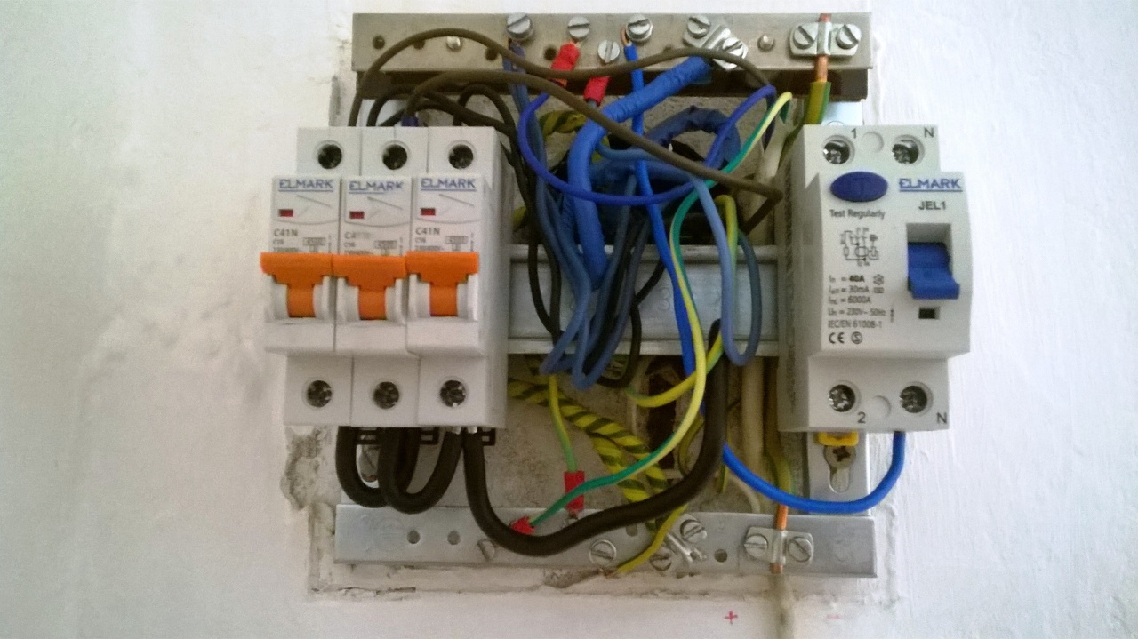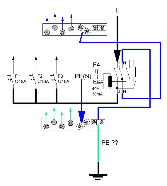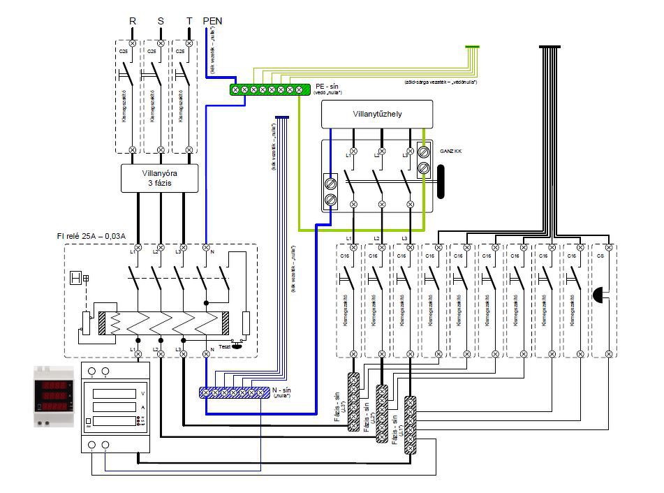 Nem egyértelmű, hogy az alsó PE sínen jobb oldalt lefele mi az a vezeték? Talán földelő szonda? Minden esetre a FI relé alkalmazása esetén az alsó PE és a felső N sín közötti zöld-sárga átkötést el kell távolítani, különben nincs értelme a FI relének! Továbbá a 16A-os kisautomaták a jelenlegi vezetékek szempontjából túl biztosítást jelentenek. 13A-os vagy 10A-est kellene használni.