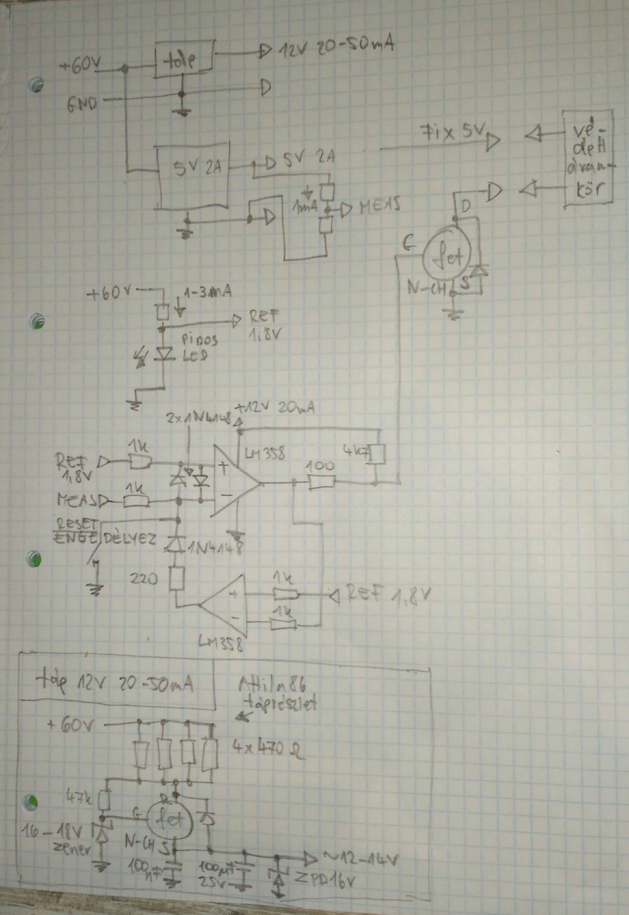 Jólvan, ahogy gondolod. Ha hamarabb mondod, hogy két feszültség lenne figyelve, akkor máshogy nézne ki a kapcsolás. A 12V 20mA-es táprész használható egyszerre. Ha a FET is közös, akkor az LM358-ak kimenetét lehet közösíteni diódával, hogy ha bármelyik hibát észlel, lekapcsolja a FET-et (2db dióda pluszban). Amit rajzoltam, az az első verzió. Ezen lehet rengeteget egyszerűsíteni, ha igény van rá, új ötleteket belerakni, stb., pl. egy 8lábú LM358-at használni, a lekapcsolva tartást pedig p csatornás FET-tel vagy PNP tranzisztorral megoldani.