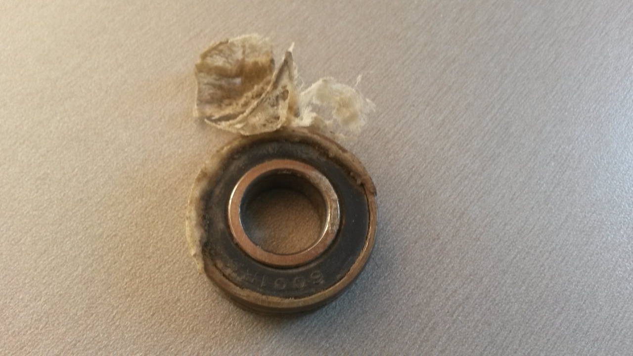 Elkészült a csapágycsere. Így néz ki a kiszedett csapágy, mellette a megolvadt műanyag szirmok, látható, hogy a csapágyra ráolvadt a megolvadt műanyag, ezért a csapágy nem tud forogni.