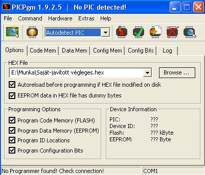 Ha a következőt csinálom, sorrendben : 1. feldugom a soros portot (a zöld led világít, ez a táp) 2. beteszem a PIC-et pontosan a helyére. 3. elindítom a PICPGM-et Ekkor még detektálja, és felismeri a 683-ast (villognak a ledek) Ezután bármire kattintok kiugrik a felismerésből, és így már passz. (Ha először elindítom a progit, és utána teszem be a PIC-et, akkor fel sem ismeri). És mindez azután lett ilyen miután faragtam a forrást.(Tehát szoftwer?)