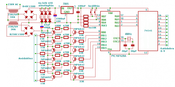 Ha viszont érdekel, úgy lehet átalakítani ledesre, hogy a 74141 IC helyére 7447-et raksz, a BCD bemenetet helyesen rákötöd a PIC kimeneteire, a 7447-re pedig értelemszerűen bekötöd a kijelzők szegmenseit megfelelő ellenállásokkal. Az MPSA92-es részt elhagyod, az MPSA42-k kollektorát tápra kötöd, emitterét pedig a kijelzők közös pontjára...