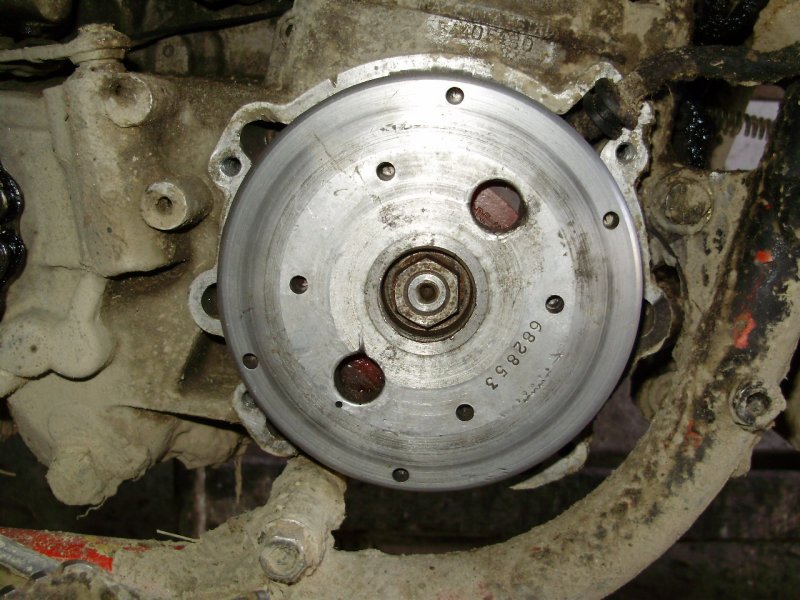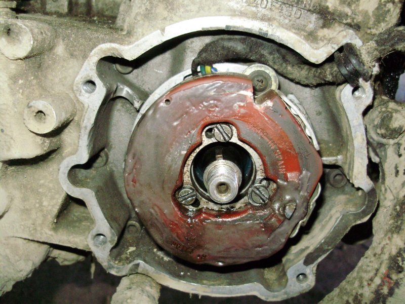 Ez a gyújtás szemmelláthatólag legalább egyszer már volt javitva. A gerjesztőtekercs a képen a ~2óra irányába esik,a szegmensen van egy szerelhető rövidzár-alu keret. A ~4óra irányban levő alukeret a jeladóé,ami külön hengeres házból áll,félig lelapolt a vasmagja és az egész bele van sajtolva a szegmensbe. A gyenge szikra oka valószinűleg az ismételten menetzárlatossá vált gerjesztőtekercs.