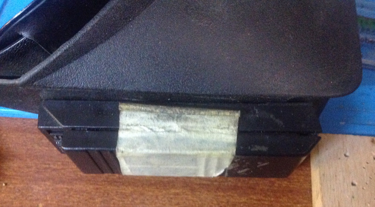 Ilyen lett az elemtarto egy napi munka után. Leesett a földre és darabokra tört. Ma sem használhato mert még a ragasztoszalag sem tartja egybe... már 4-t törtem össze, ez az egyy maradt mutatoba. De ezt sem használom már.
