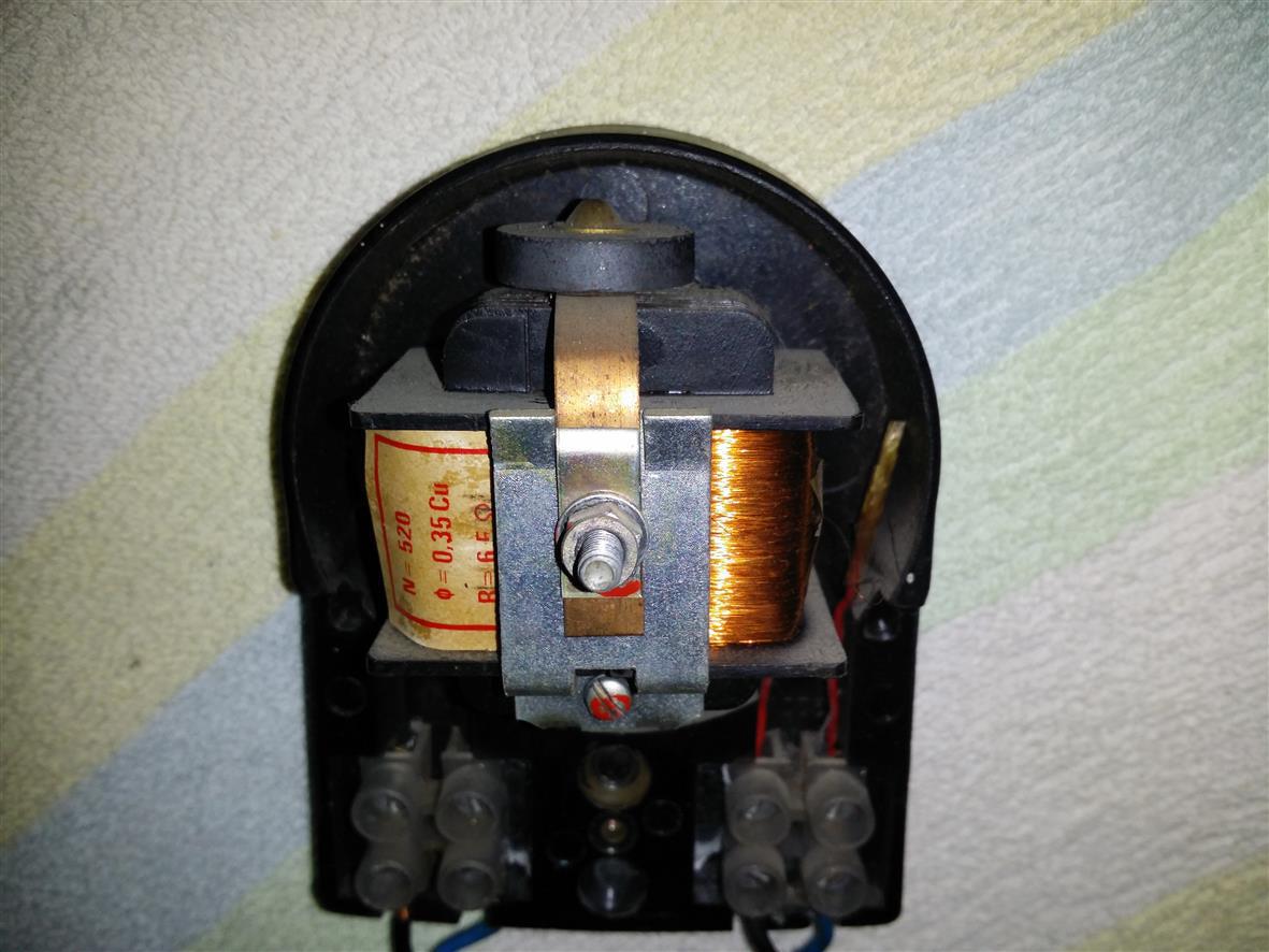 Akkor ez "már" az érintkező nélküli típus. A mágnes rugóját úgy kell beállítani, hogy a kalapács éppen ne érjen a haranghoz. Ha meghibásodáshoz lehet a tekercs menetzárlatos (bár ennek valószínűsége kicsi, mert nem látható hevülés nyoma), vagy a mágnes elgyengült az idők folyamán. Ez tulajdonképpen egy trafó, aminek a szekunderét rövidrezárva erősen megemelkedik a gerjesztés, ezért rángatni kezdi az 50Hz a mágnest. De alaphelyzetben is rezeghet cseppet.