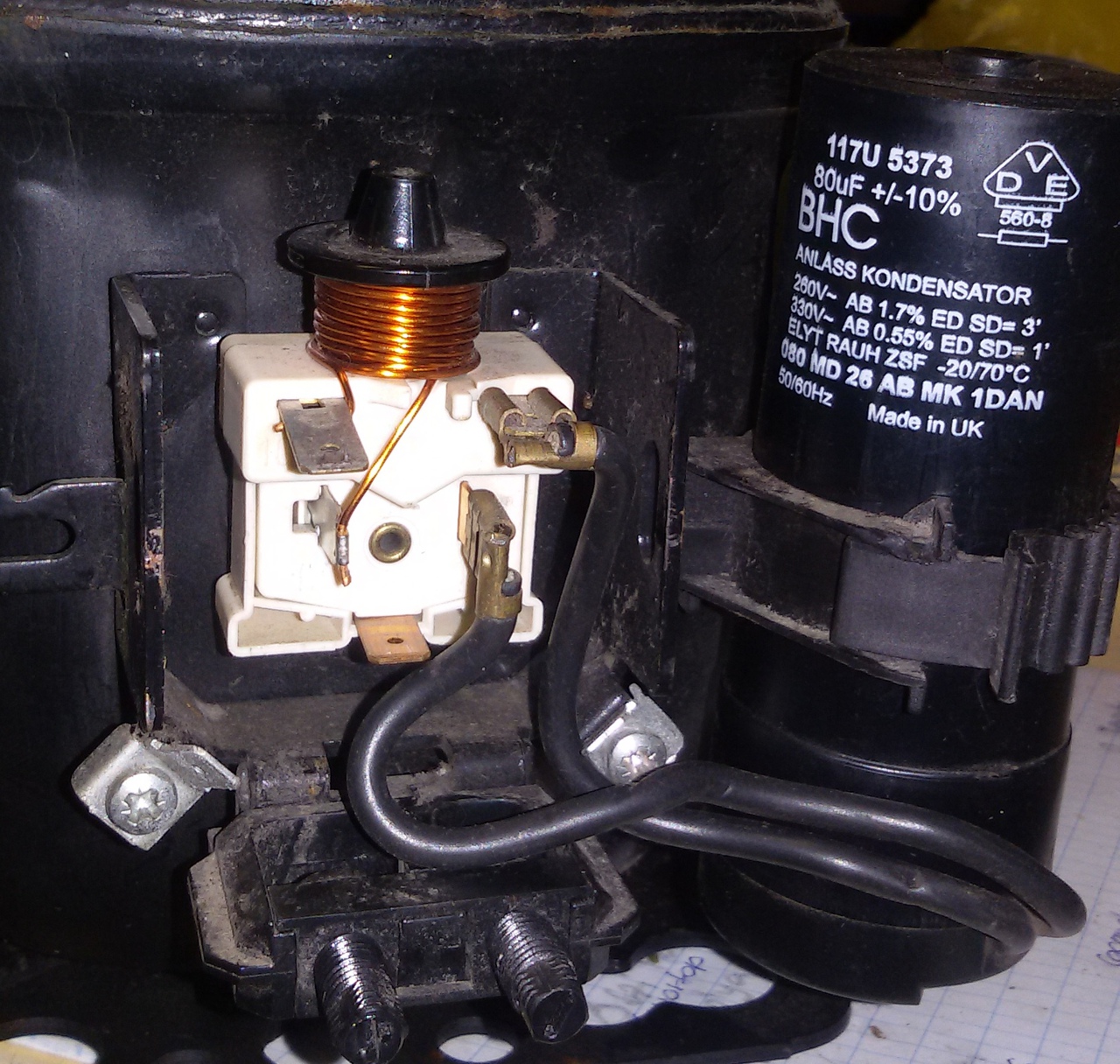 EZ egy jobb rajz a kompriról és annak bekötéséről. Mind egyforma ebben a márkában. A relé is átlagos és a PTC is ami 25 ohm értékű.