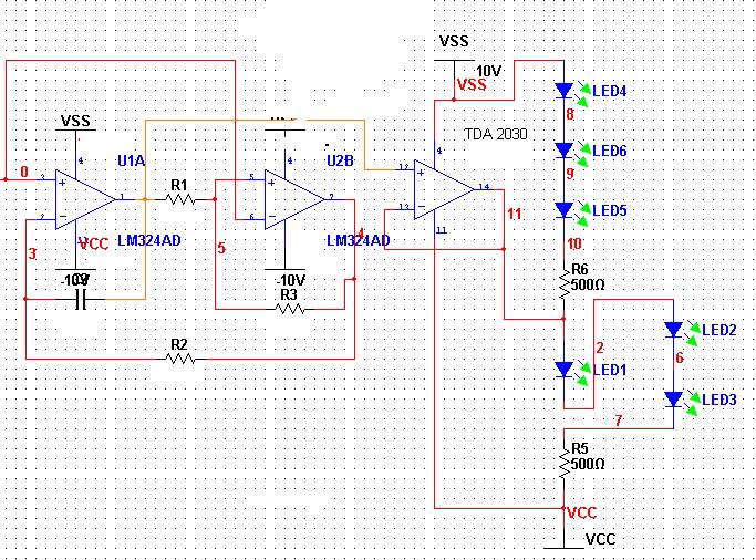 Esetleg valami egyszerűbb teljesítmény végfokkal is működhet tranzisztorok nélkül.(A leddel soros ellenállások újraszámolandók)