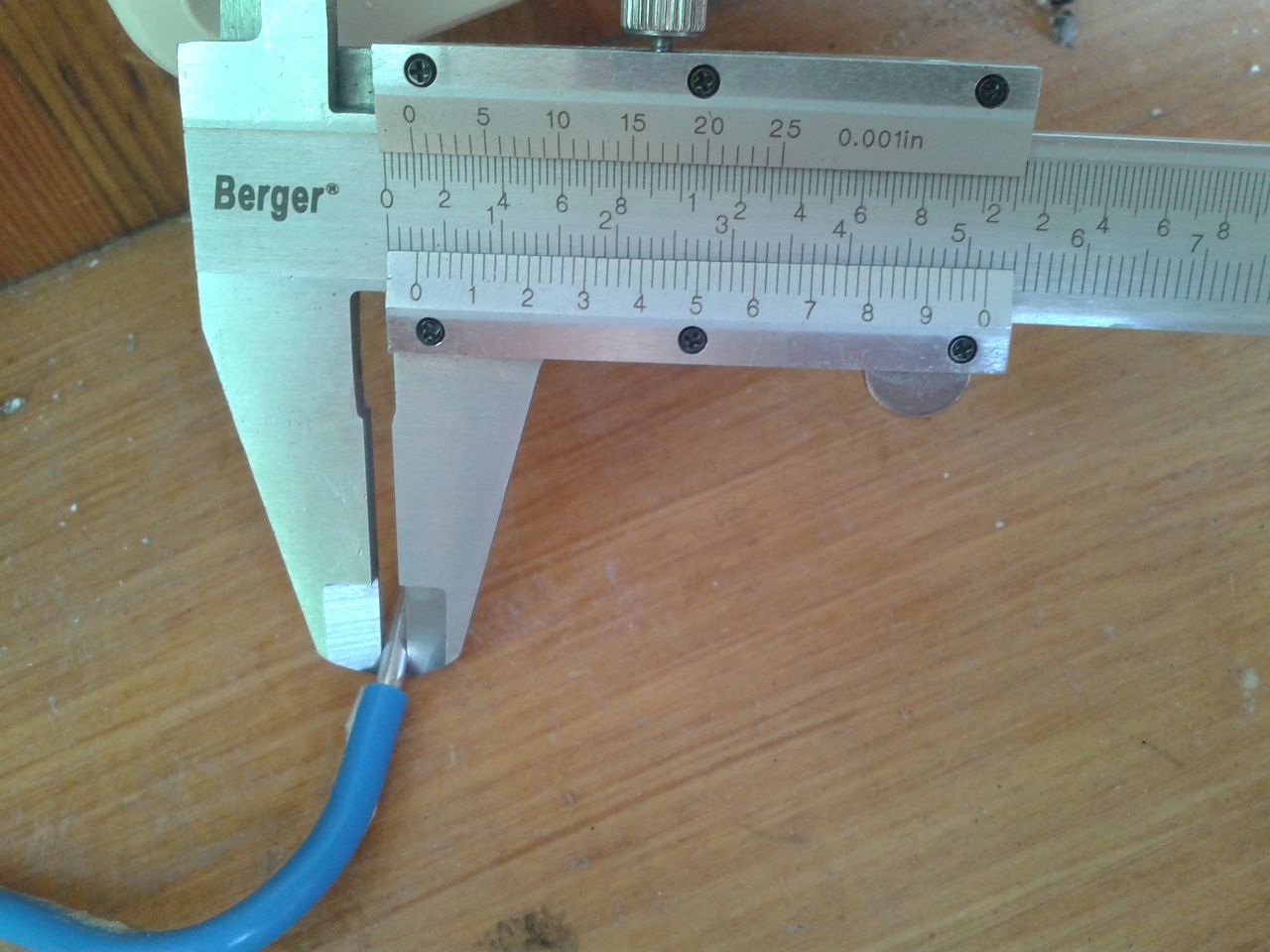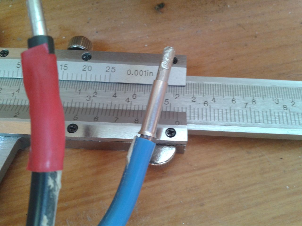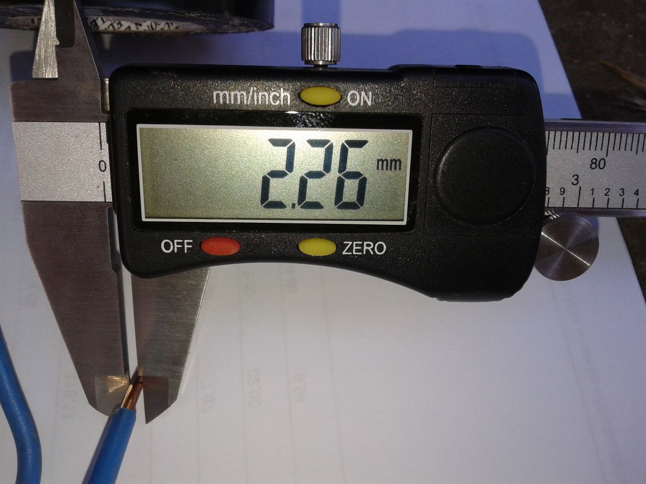 Megmértem az alumínium vezeték átmérőjét, amiről szó volt korábban, érdekességképpen feltöltöm a képeket erről. Kiszámolva, a vezeték keresztmetszete ~5.6mm2-re jön ki, így nem csoda, hogy a 221-es wago nem fogja meg rendesen, ki lehetett húzni belőle. Azt hiszem ezt 6mm2-esnek lehet venni. Egyébként egy 4-es érvéghüvelyt rá lehetett húzni még éppen. Összehasonlításképpen egy 4-es réz vezetéknek az átmérője pontosan a névleges keresztmetszetéhez passzol.