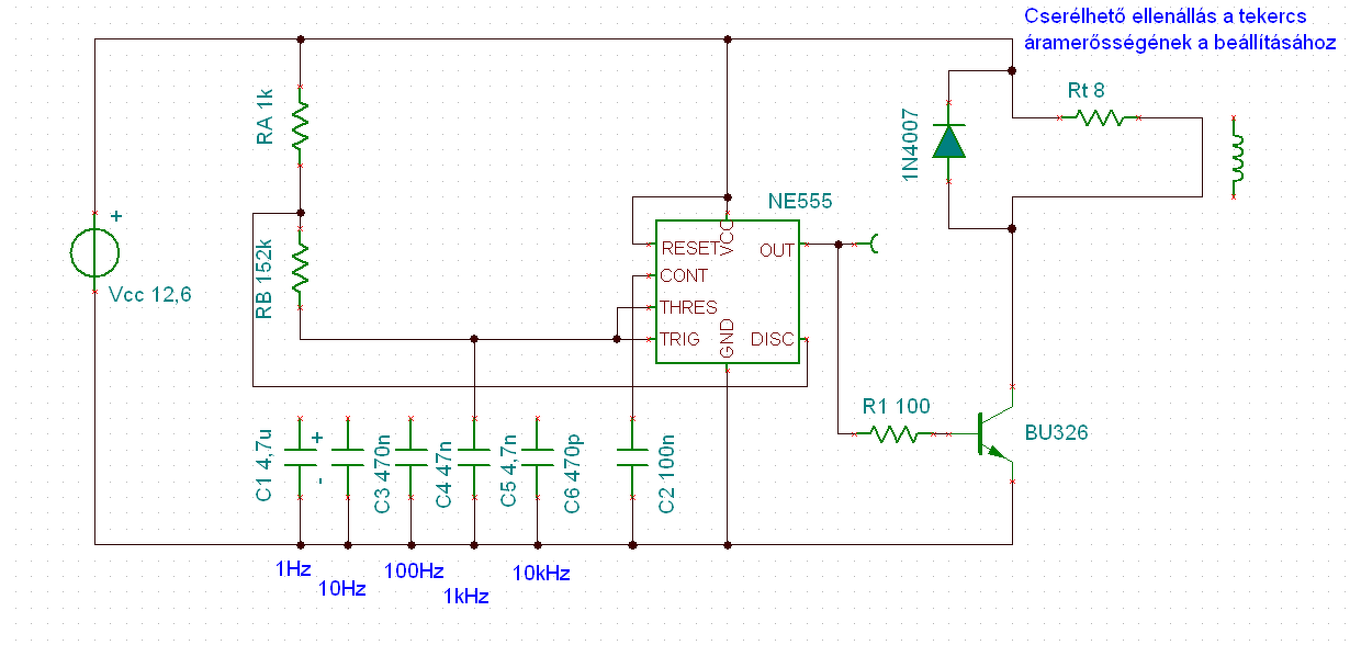 Megpróbálom egy feszültségosztóval lecsökkenteni a tekercsre jutó feszültséget de most még nincsenek ilyen ellenállásaim. Az áram gyors csökkenésének a hiányát úgy mértem, hogy a vasmagos tekercs "mellé" raktam egy szekunder tekercset úgy hogy metssze a tekercs indukció vonalai a szekunder tekercset, és egy másik műszerrel mértem az indukált feszültséget. Amikor kézzel kapcsolgatom a tekercs áramát, amilyen gyorsan csak tudom, "kb: max. 4Hz" akkor viszonylag nagy feszültség indukálódik a szekunder tekercsben (20-25V). De amikor az áramkörre kötöm és a tranzisztor kapcsolgatja, nem történik semmi. Ezért gondolom hogy hogy mivel az indukált feszültség az idő függvényében jön létre, nem csökken le elég gyorsan az áram.