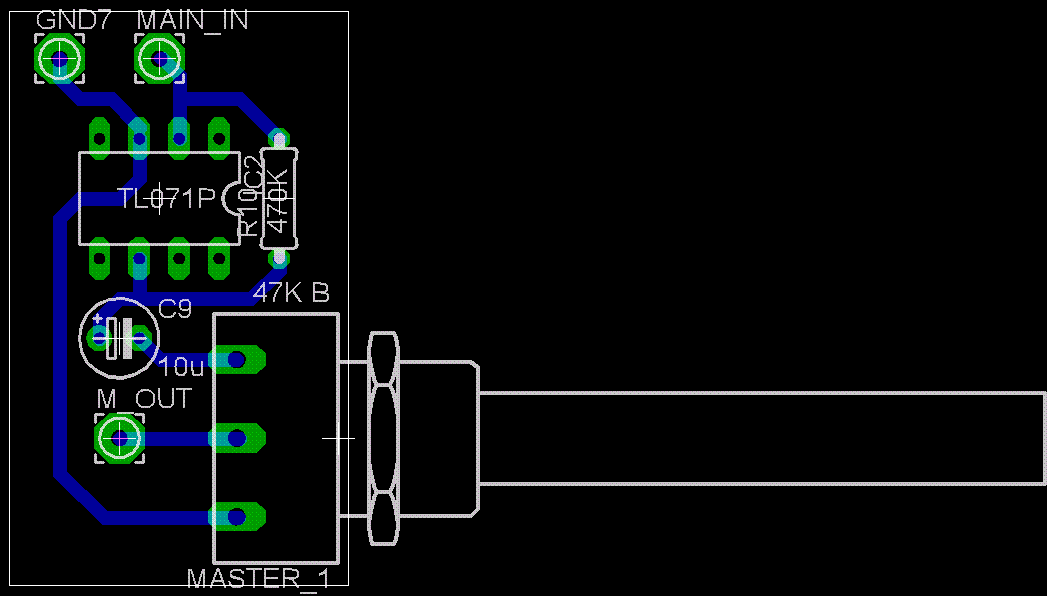 - Jól alakítottad át, csak ha nincs "pan" poti, akkor minek van a 10kohm és 47kohm sorbakötve? Semmi értelme nincs elég egy 47kohm-os ellenállás is. - Azért köti össze a lábait, mert a TL071-eknek nincs a tápfesze bekötve, és azt jelzi. Mivel ezek az IC-nek azonos lábai (4-4, 10-10, ezért látszik úgy mint ha a gumivonal összekötné saját lábait. Amúgy a nyák rajza jó, azt kivéve, hogy a GND vezetéket sokkal vastagabbra készíteném. Ha a C7-C8 szembefordított két kondi, akkor a C10 miért nincs ugyan így kialakítva? üdv! proli007