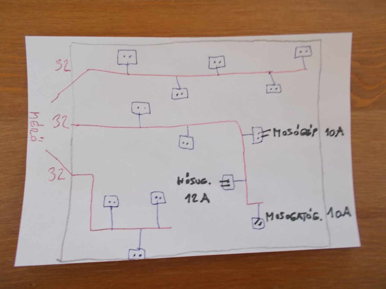 Csináltam egy béna rajzot ahogy értelmezem az egészet.Van a 32A főmérő amire megy a 3db 32A kismegszakító és azokról megy a vastag vezeték át a házon ami bírja a 32A-t.A konnektorokban megmarad az eredeti vezetékezés amik 16Aosak és rácsatlakoznak erre a 32A vezetékre.Tehát egy konnektor most is csak 16A-t tudna fogadni de mindegyik egyenként a 32A vastag vezetékre csatlakozik.Akkor megmarad a jelenlegi vezetékezés nagy része és bírja a többlet terhet is.Ha az egyik kismegszakítóra ráteszek mosógépet(mondjuk 10A),mosogatógépet(még 10A),hősugárzót(12A) de mindegyik konnektor külön vezetékén megy a vastag vezetékbe,akkor a konnektorok sincsenek túlterhelve és a vastag vezeték is kibírja a 32A áramot amik összeadódnak a 3 példagép esetén.Ez ugye csak a saját értelmezésem a dologra és lehet hogy teljes ostobaság,csak nekem az az elképzelés nagyon tetszik hogy az embert már nem a 16A hanem a 32A korlátozza.Kiemelem hogy minden konnektor saját vezetékén fut és nem megy egyik a másikból,erre nagyon odafigyeltünk anno amikor az alumíniumokat cseréltük le.