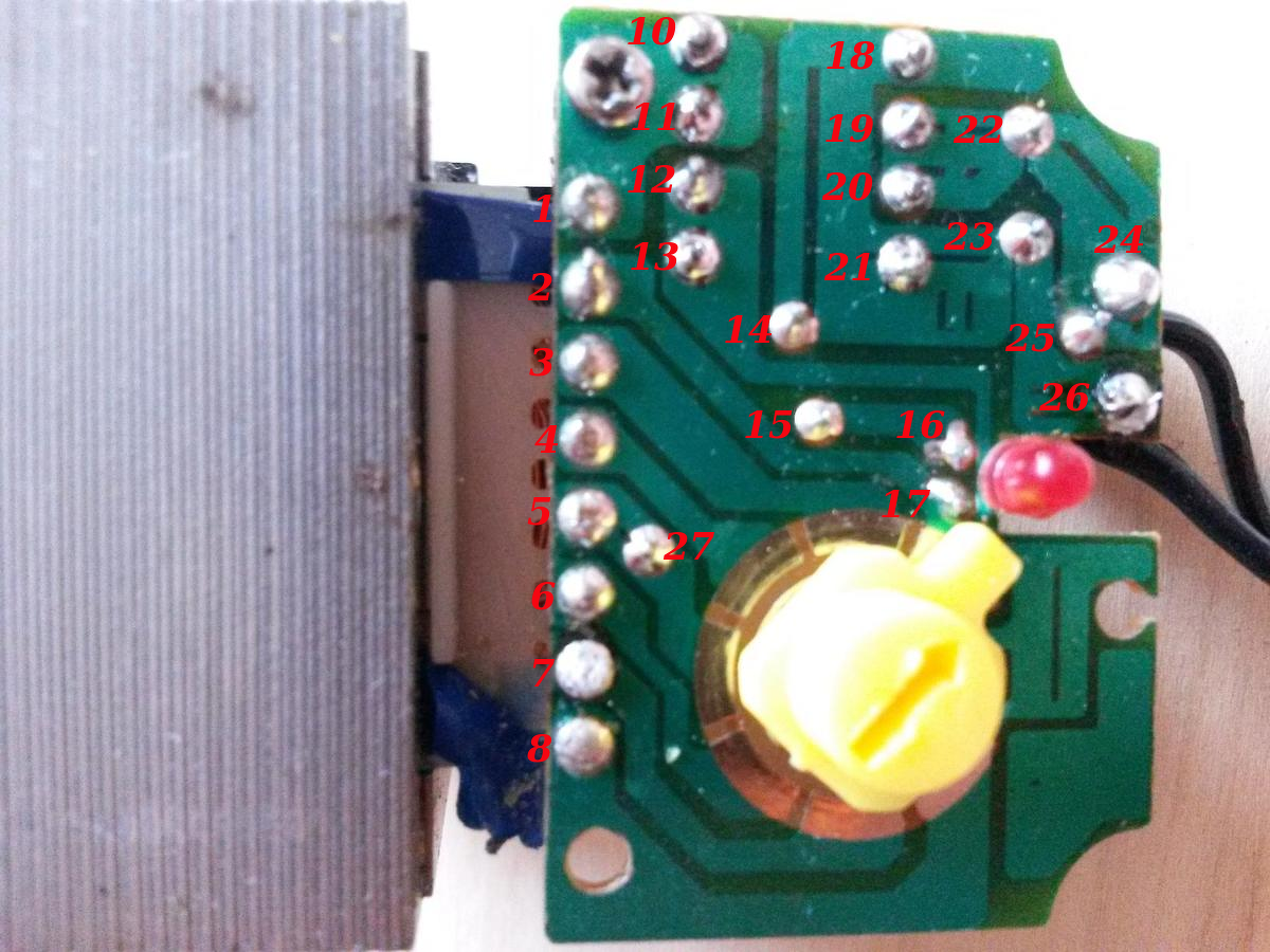 Nos, talán megkönnyíti számotokra a segítséget, ha közlöm ezt a képet, melyen megszámoztam a NYÁK forrasztott tüskéit.