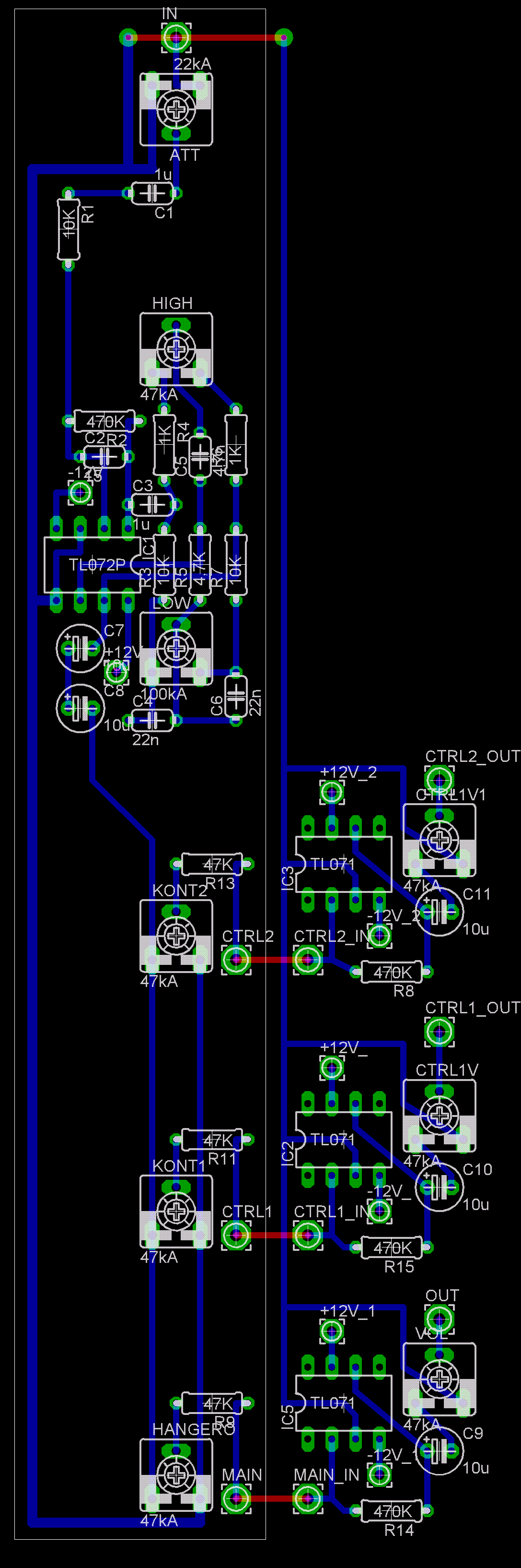 - Jól alakítottad át, csak ha nincs "pan" poti, akkor minek van a 10kohm és 47kohm sorbakötve? Semmi értelme nincs elég egy 47kohm-os ellenállás is. - Azért köti össze a lábait, mert a TL071-eknek nincs a tápfesze bekötve, és azt jelzi. Mivel ezek az IC-nek azonos lábai (4-4, 10-10, ezért látszik úgy mint ha a gumivonal összekötné saját lábait. Amúgy a nyák rajza jó, azt kivéve, hogy a GND vezetéket sokkal vastagabbra készíteném. Ha a C7-C8 szembefordított két kondi, akkor a C10 miért nincs ugyan így kialakítva? üdv! proli007