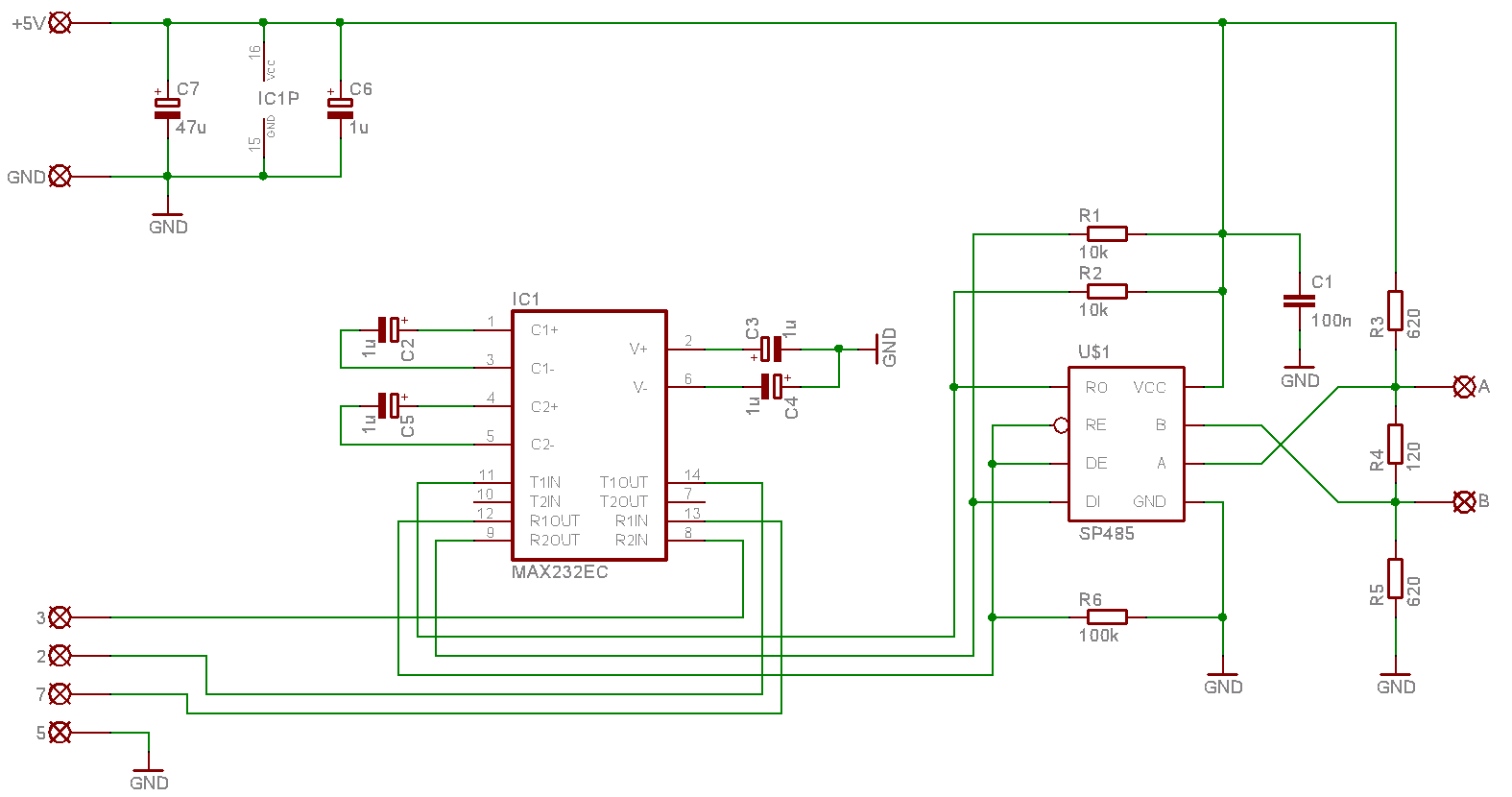 Csatolom az általam épített 232-485 half-duplex átalakító rajzait, hátha segít. Igaz, smd, de az volt kéznél, mikor csináltam. Nem méretarányos, az igazi jóval kisebb, az elhelyezés miatt nagyítottam rajta. Az A és B vonalak fel- illetve lehúzó ellenállásokkal is el vannak látva, a szabványnak megfelelő átalakítók nézegetése után tettem rá ezeket (frekvenciaváltóhoz készült). Az adat- és vezérlővonalakon is vannak ellenállások, de az csak a MAX232 miatt lett így, anélkül nem volt stabil, szerintem te elhagyhatod.