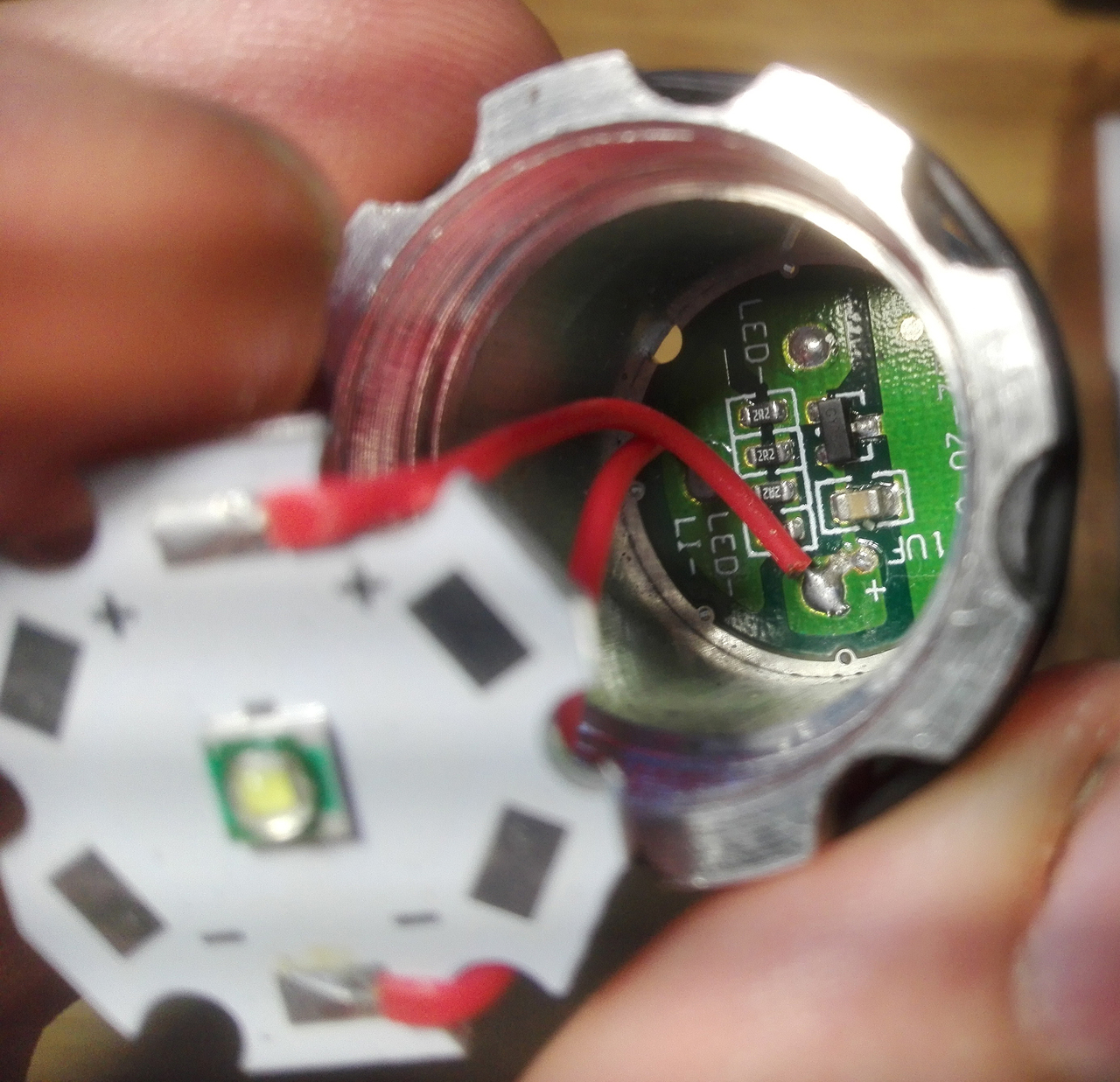 A képen egy Wolfeye zseblámpa klónja van, úgy nézem CREE XM-L T6 LED-el. Ezekkel a lámpák több fokozatúak LOW-MID-HIGH fényerőfokozat, bekapcsolásonként léptet köztük, a probléma az, hogy van még 2 fokozatuk, amit valószínűleg senkisem használ: strobe-SOS villogós, idegesítő. A kérdés ezek hogyan iktathatóak ki lehetőleg a többi mód megtartásával (de nem feltétlen) A neten utána nézegettem-ezekben általában egy SOIC8 SMD IC van és az felelős a programért AMC7135 IC-k felelnek az áramgenerátorért (ahány van a panelen annyiszor 350mA-t tud a lámpa, a központi IC meg köztük választ). Nos az én lámpámban nem találok ilyen IC-t se AMC7135-t csak 4 ellenállást, egy 1µF kondit és egy tranzisztort-anon gondolkozom mi lenne, ha a kondenzátort kiforraztanám, telán elszállna az RC-tag és nem tudna villogni, szerintetek?