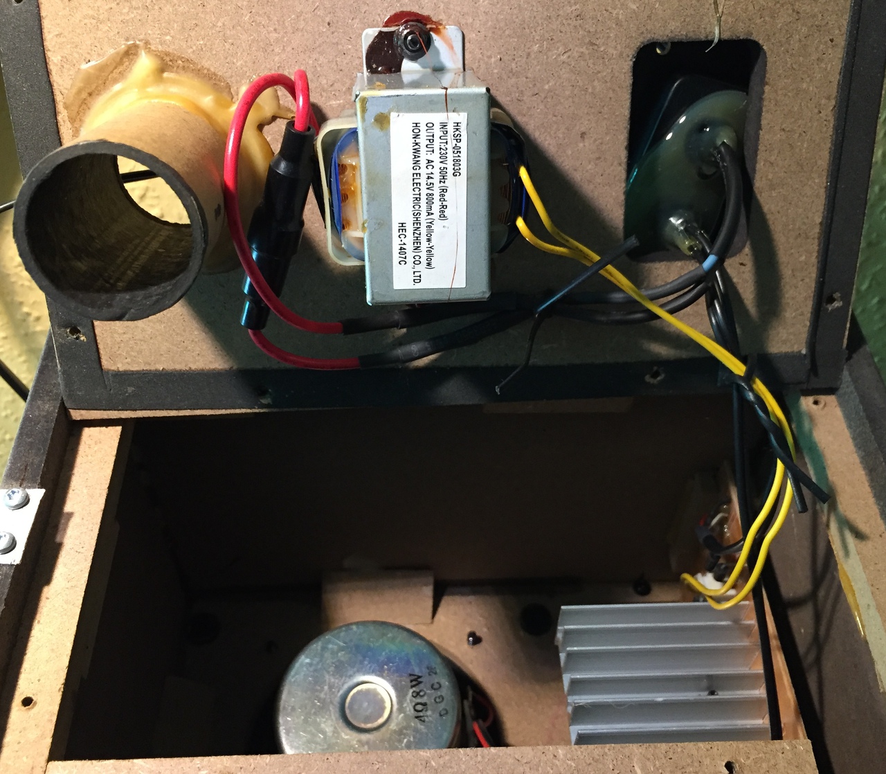 Szétszedtem, ahogy sikerült belefotóztam. A trafó meleg, de nem forró, az alu hűtő úgyszintén. Két kondit kicsit púposnak látok, a nagyot és a közepesből a belsőt.