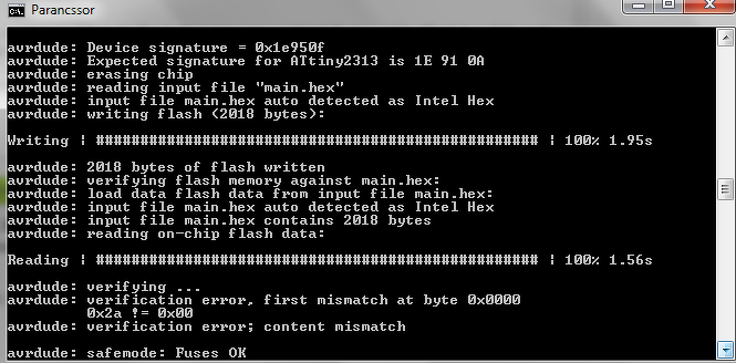 Segítsetek légyszi, mert nem jutok ötről a hatra. Van egy, a WinAVR gcc-vel fordított hex fájl, amit szereték beírni egy ATTiny2313-ba, de sehogy sem sikerül.... Programozónak egy Arduino-t használok avrdude-dal.