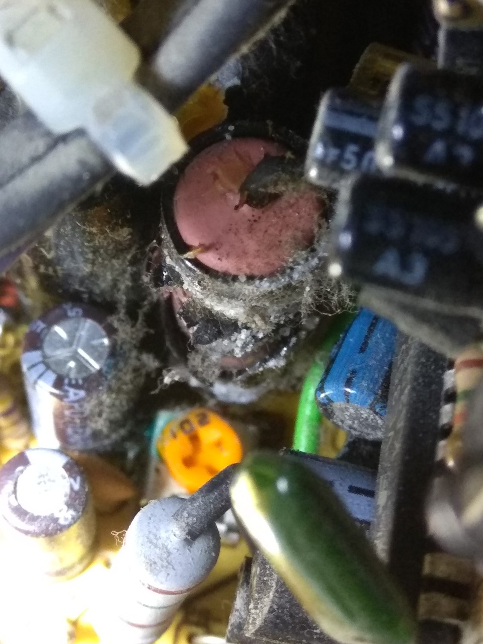 Ha tudod takarítsd ki sűrített levegővel először a tápot, utána ha lehet mutatsd meg mondjuk pirossal körbe karikázással melyik alkatrészre gondolsz, illetve lehet nem ártana több szögből is megközelíteni a témát (alkatrészt). A képen nekem csak felrobbant kondenzátoról kiszóródott aluminium csíkokhoz hasonlót vélek felfedezni.