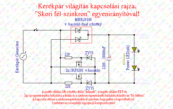 Az első lámpának nagyobb áram kell, a hátsónak kevesebb. A JY7006v2-ben 400mA-nél korlátoz az elektronika, tehát 1W-nál valamivel többnél, az álló olyan 28-30mA-nél. Hátra elég 20mA és egy 5mm-es fényes piros LED, ez már jó fényerőt biztosít. Álló helyzetben 5mA-re korlátoztam. Az agydinamó váltakozó feszültséget ad és elvileg korlátozva van. Általában 3W-osak, LED-hez bőven elég. Először egyenirányítani kell, majd puffer és szuperkondenzátor elektronika (max 5V!). Utána jöhet a LED meghajtás. Mivel ennek a nagy kapacitású kondenzátornak idő kell a feltöltődéshez addig tartalmaz kerülő utat, olyankor villog. Ellenkező esetben nem igazán világítana induláskor és lassú menetben. Ha folyamatos fény kell, akkor elemes lámpa. Mi a baj a villogással? Az elemes LED-es utólagos lámpákat szinte mindenki így használja villogva, jobban észrevehető. A villogás itt még gyorsabb is, mint az elemesnél.