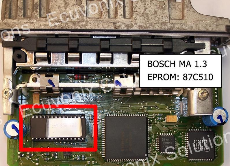 Feltehetőleg egy UV fénnyel törölhető EProm -ról van szó. Kivehető a foglalatból, kiolvasható, de az írás előtt UV fénnyel (~400nm) kell törölni. Ehhez a fehér matricát el kell távolítani. Ha a kód már jó és hosszabb ideig szükség lesz rá, az ablakot ismét le kell ragasztani fényt át nem eresztő matricával.