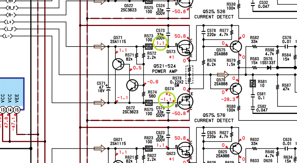 Szia! Mekkora feszültség esik a 100 Ω és a 0,22 Ω ellenállásokon. Előbbin a végtranzisztor megfelelősége, utóbbin a nyugalmi áram ellenőrizhető.