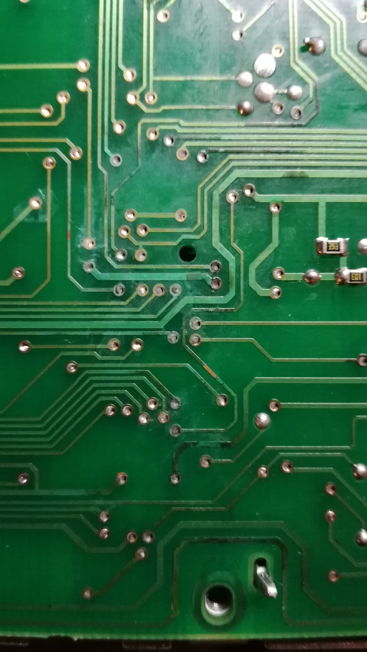 Szétszedve semmilyen sérülést, repedést, forrpont elválást nem látok, gyönyörű az egész. A hátoldalán találtam csak problémát, egy részen korrodáltak a furatgalvánok, az a környék elég csúnya. Sok vezetősáv innen az előlapi csatlakozóhoz vezet.