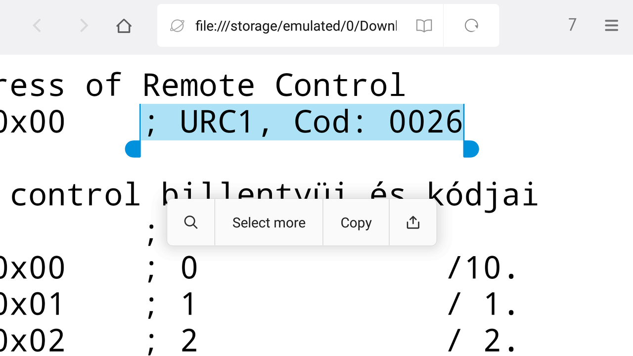 as I wrote you, the source files look for "keys.asm" in the folder where the sources are. To change anything the file " keys628_URC1_0026.asm" has to copied to "keys.asm" in the folder of rotor and in the folder of base. Any change should be made in keys.asm files. Idézet: „;URC1, Cod: 0026” Strings with semicolon in the beginiing are comments for the assembler. This mark is for us to remember what setting should be done in URC1 Universal Remote Control device. Pressing the Set button on it and pressing four number button the controll set can be activated. URC1