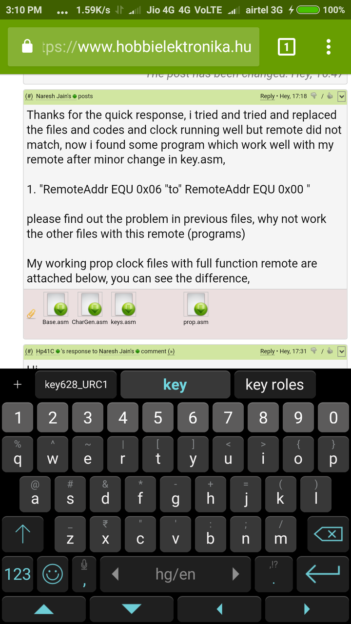Dear friend, Please check my latest files uploaded today, I used the key628.asm to compile the both hex files, this key628.asm file is working with original Henk soubry propeller clock and my remote, commands are set in this file according my remote, my remote is full working,