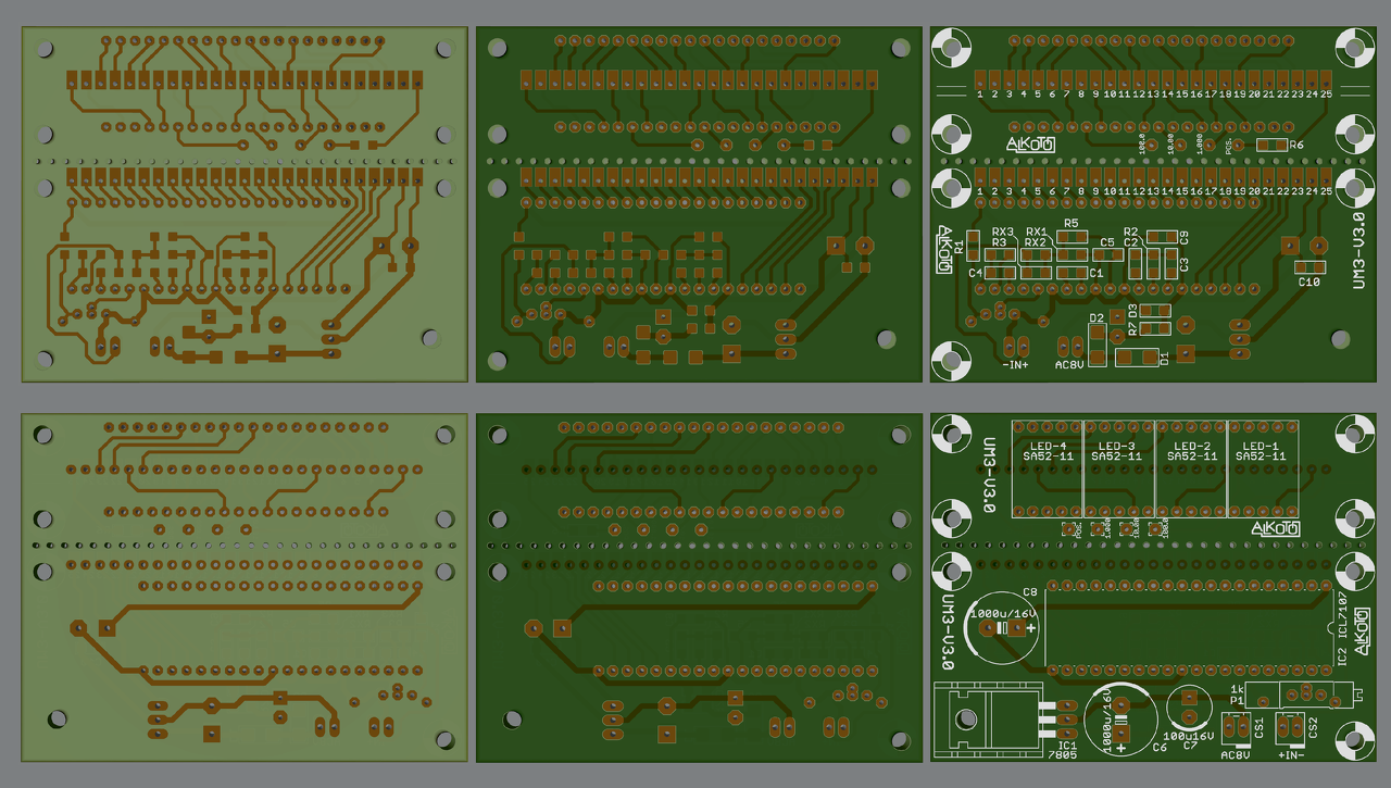 A kihívást az jelenti, hogy a kapcsolási rajzon nem látszik a két panelen való megvalósulás. Tehát nincs ott egy sorozat csatlakozó, vagy tüskesor, vagy ilyesmi. Kigondoltam önerőből is egy megoldást, ami látszatra remekül megfelel az elvárásomnak. Próbáltam ezt szemléltetni a mellékelt ábrán, aminek felső sorában a panel Bottom oldaláról készült képek láthatóak rétegenként, az alsó sorban pedig a Top oldalé azonos módon. A saját kitalációm szerint utólagosan tettem fel PAD-eket, amiket elneveztem az adott vezetéknévre, és mintha átkötések lennének úgy funkcionálnak. Ezzel a PAD-es megoldással elértem, hogy mindkét oldalon beköthető a pont, illetve ha valamiért az alapgondolat helyett huzalozottan kerülne a két panel összekötésre, akkor ezek a lyukak ezt elősegítik. De elsősorban nem huzalozás a cél, hanem a vezérlő panel élének és a kijelző panel lapjának a közvetlen csatlakoztatása, a panelon lévő szigetecskéket felhasználva. A szigetek jelenleg a PAD-ek köré rajzolt téglalapok. Gondoltam a poligonra is, de a sima téglalap praktikusabbnak tűnt. Kérdezem a programot és a panelgyártási lehetőségeket tőlem jobban ismerőket, látnak-e valamilyen buktatót, hibát, esetleg egyéb anomáliát a megoldásomban, illetve van-e ettől praktikusabb megoldás a feladatra?